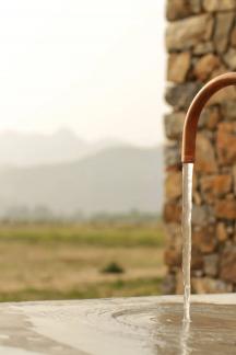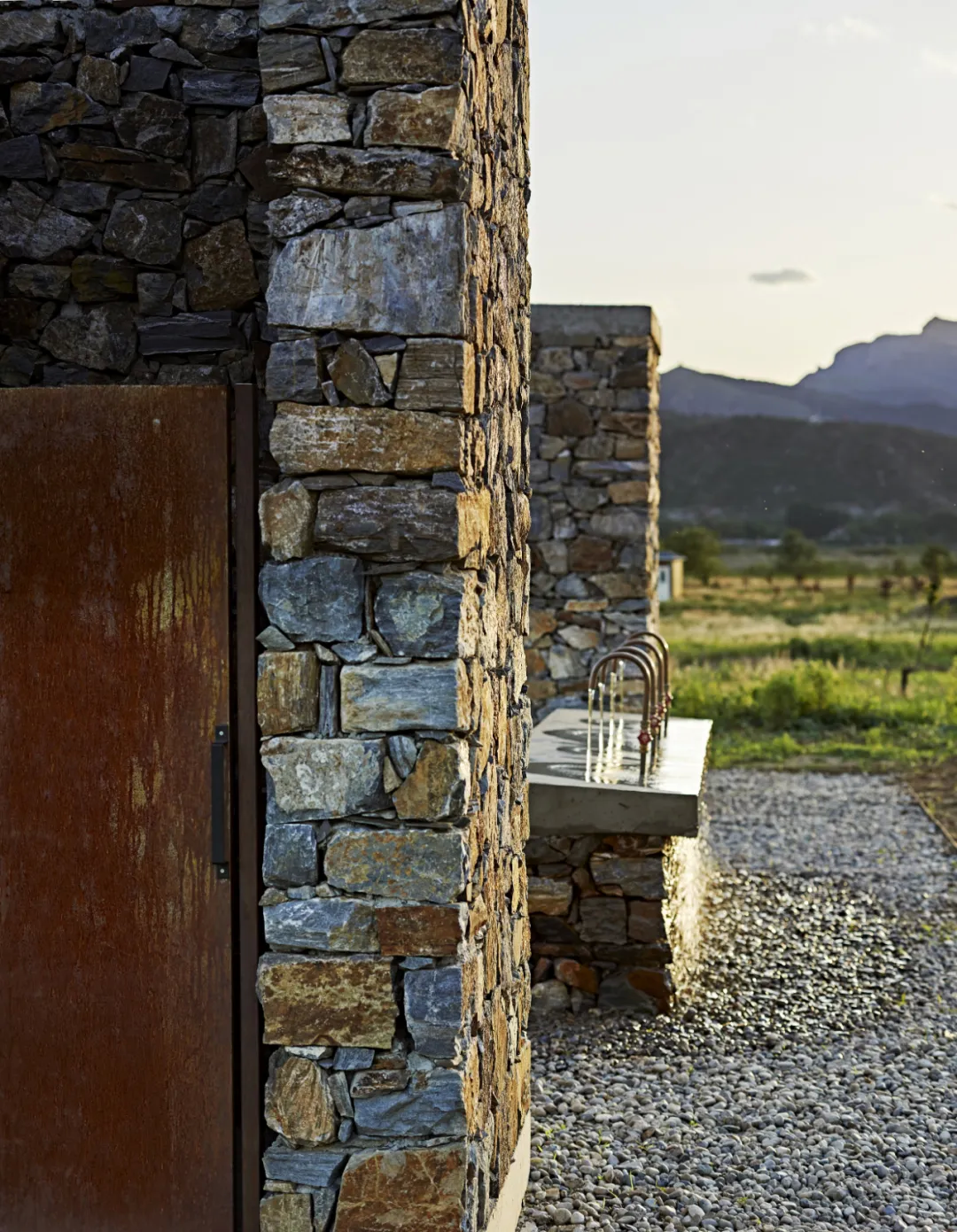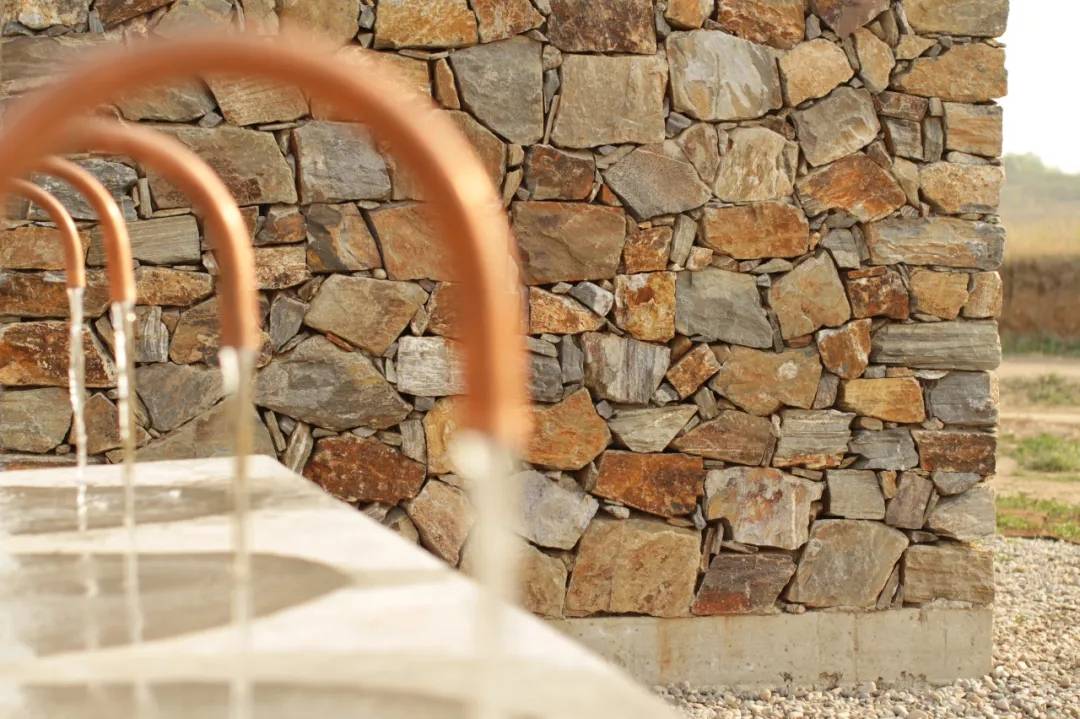 項(xiàng)目所用的天然石材包括鵝卵石均來自附近采取,簡(jiǎn)單的銅管被彎成水龍頭,石頭墻是當(dāng)?shù)毓と司牡慕茏鳌?個(gè)小型基礎(chǔ)設(shè)施元素旨在突出其為適合景觀的簡(jiǎn)潔構(gòu)造,同時(shí)它們也標(biāo)記著公園里的幾個(gè)目標(biāo)建筑。