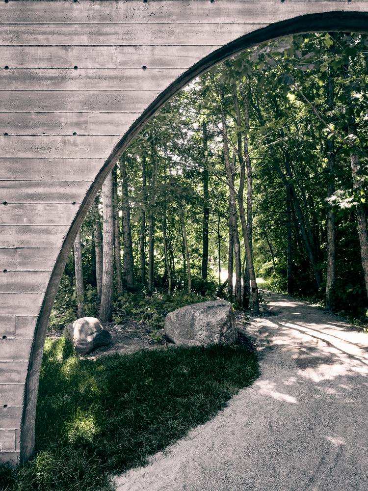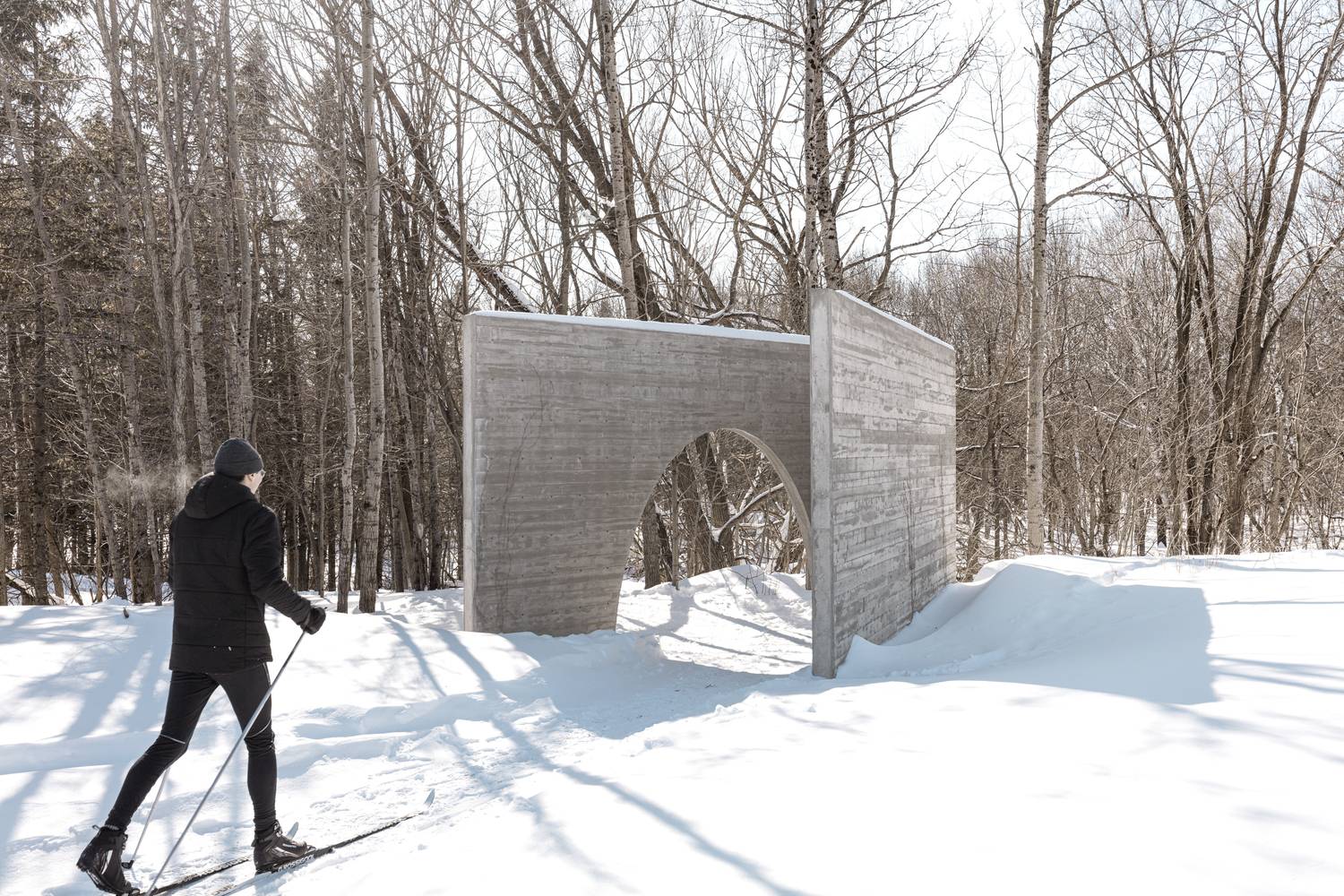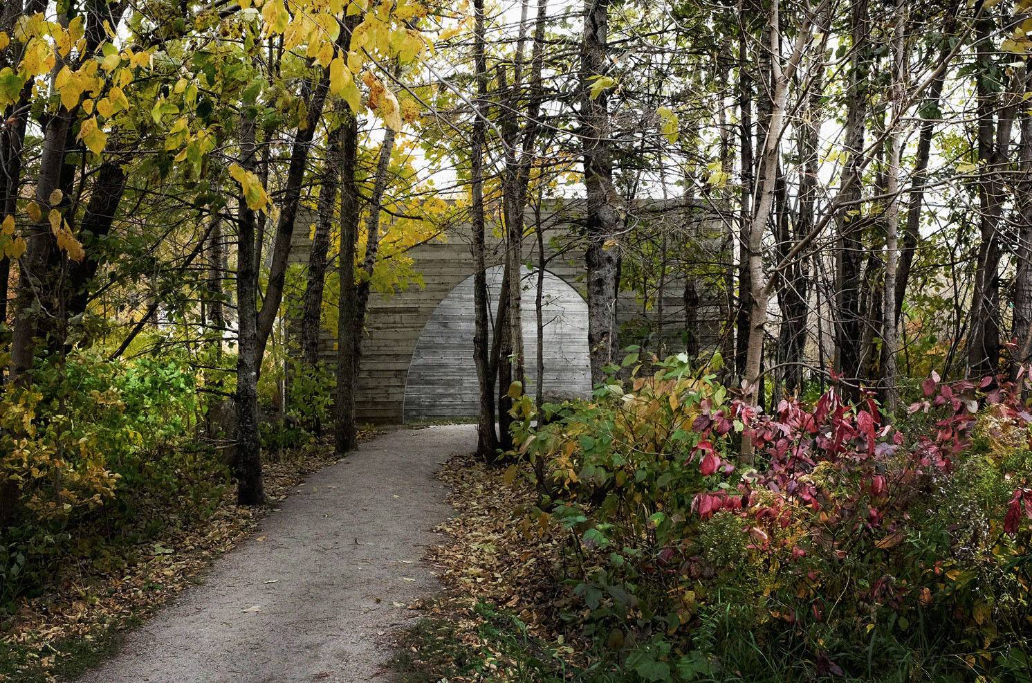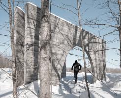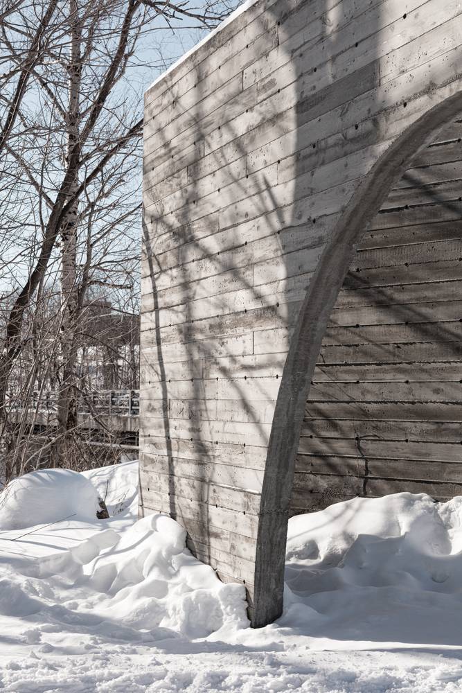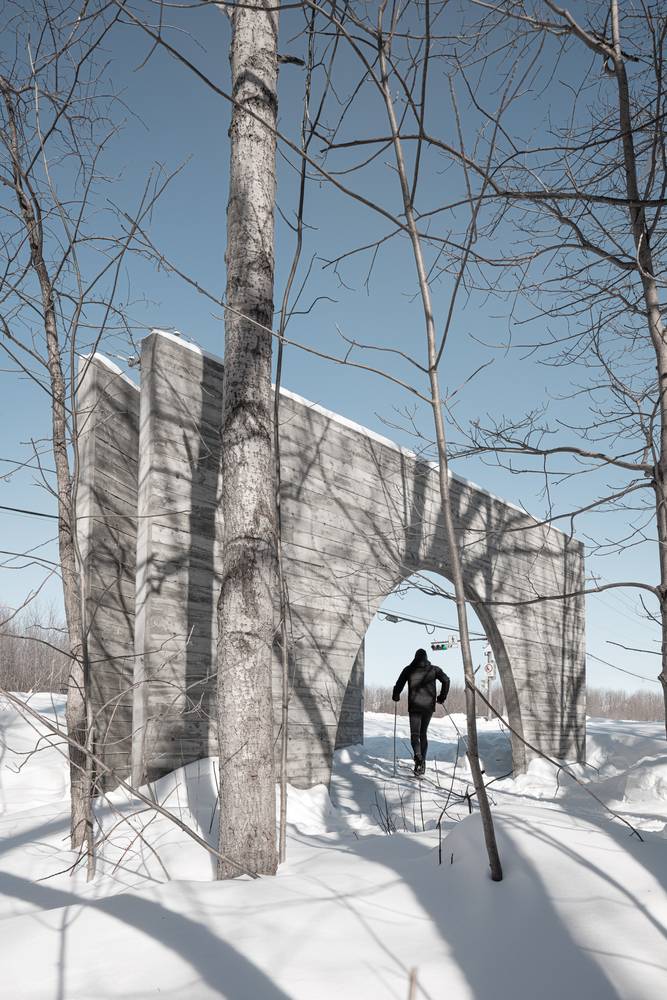 作品形如一本打開著的書,邀請來訪者走入一個物理或虛擬意義上的新景觀。寬大的拱形門框與實墻呈角度擺放,詩意地圍合出一個過渡空間,連結城市道路與帶狀的 Rivière-Saint-Charles 公園的自然景觀。