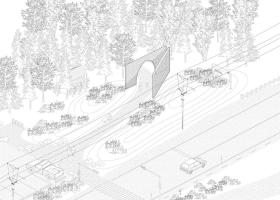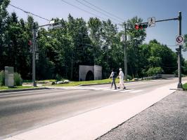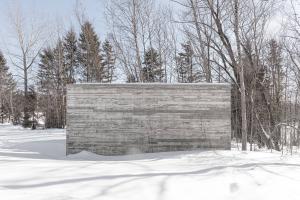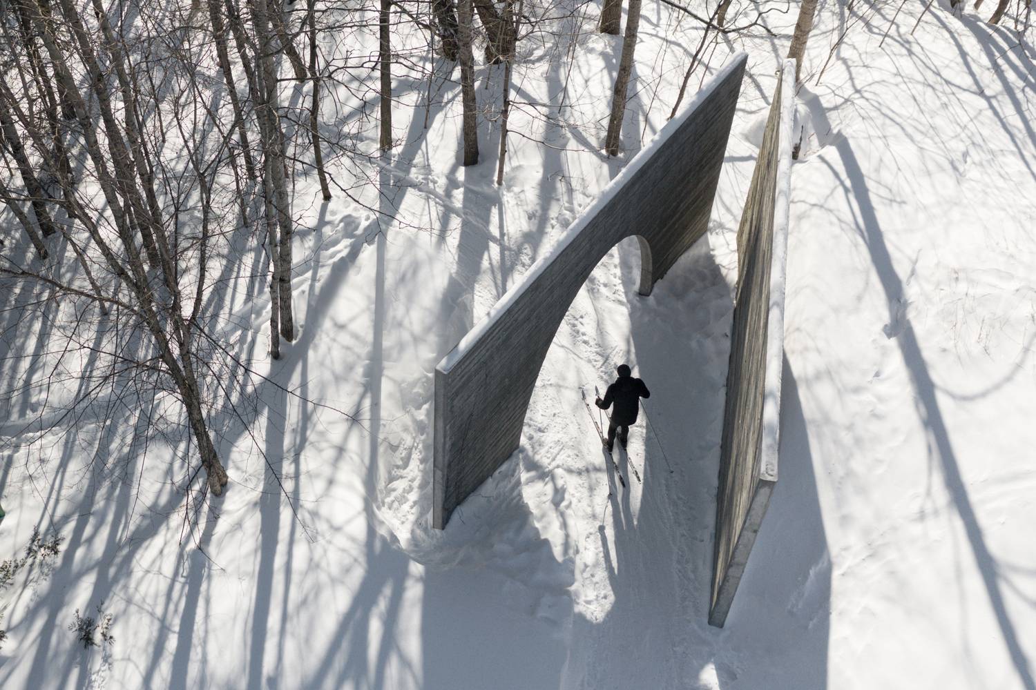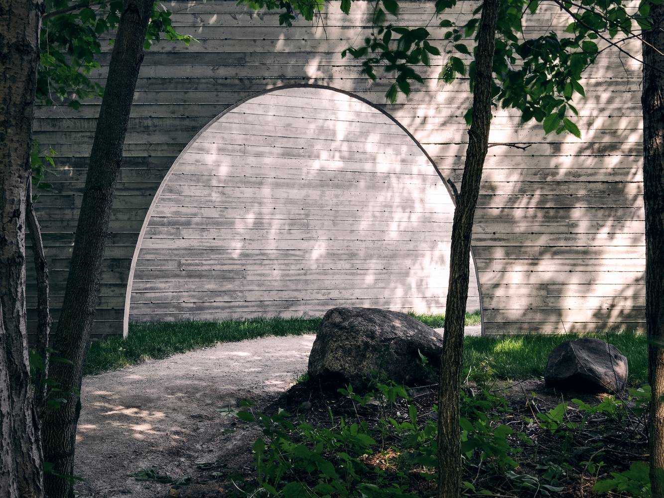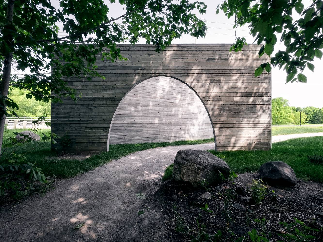 作品形如一本打開著的書,邀請來訪者走入一個物理或虛擬意義上的新景觀。寬大的拱形門框與實墻呈角度擺放,詩意地圍合出一個過渡空間,連結城市道路與帶狀的 Rivière-Saint-Charles 公園的自然景觀。