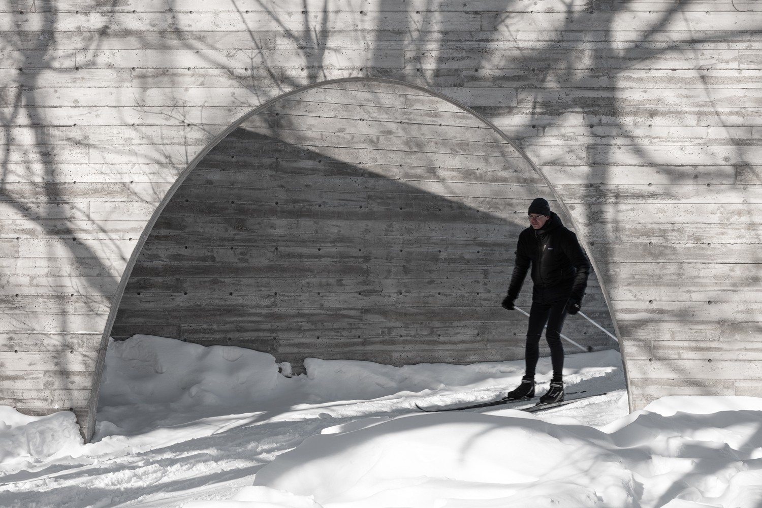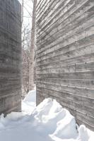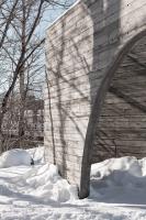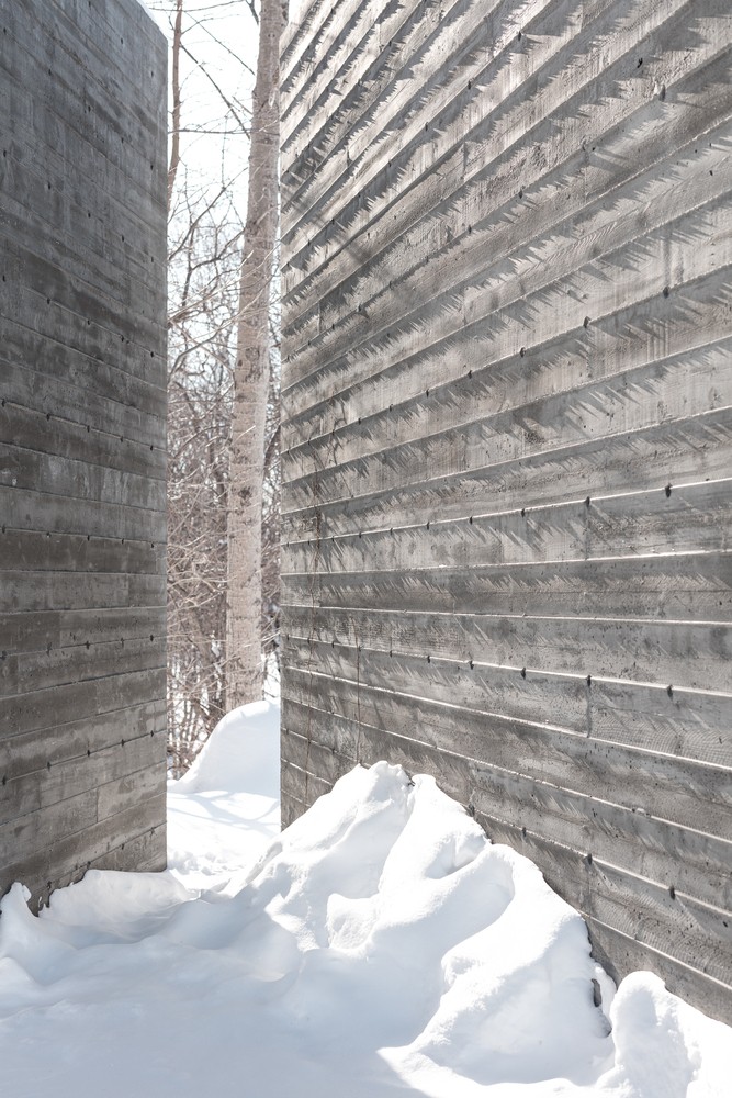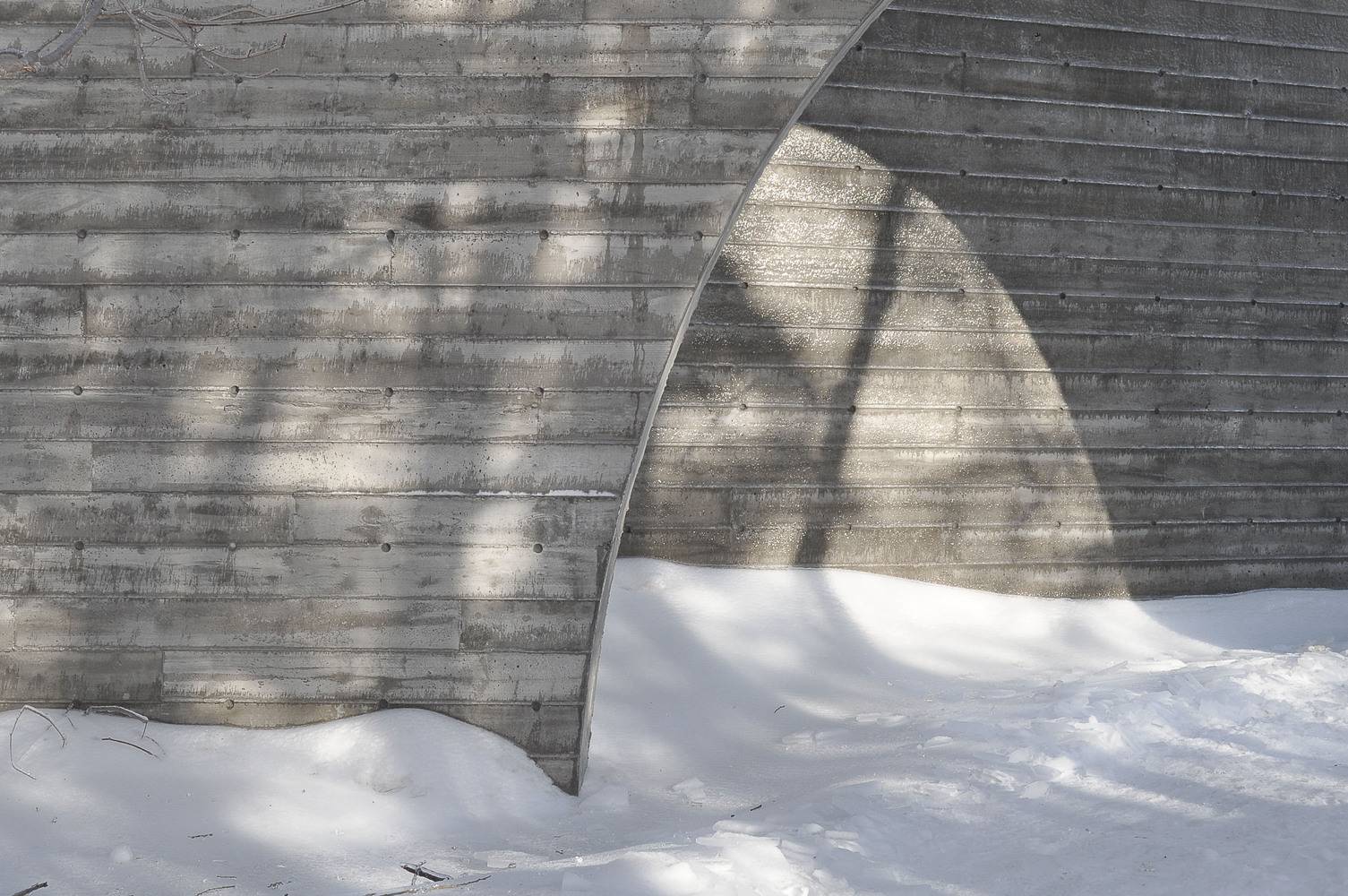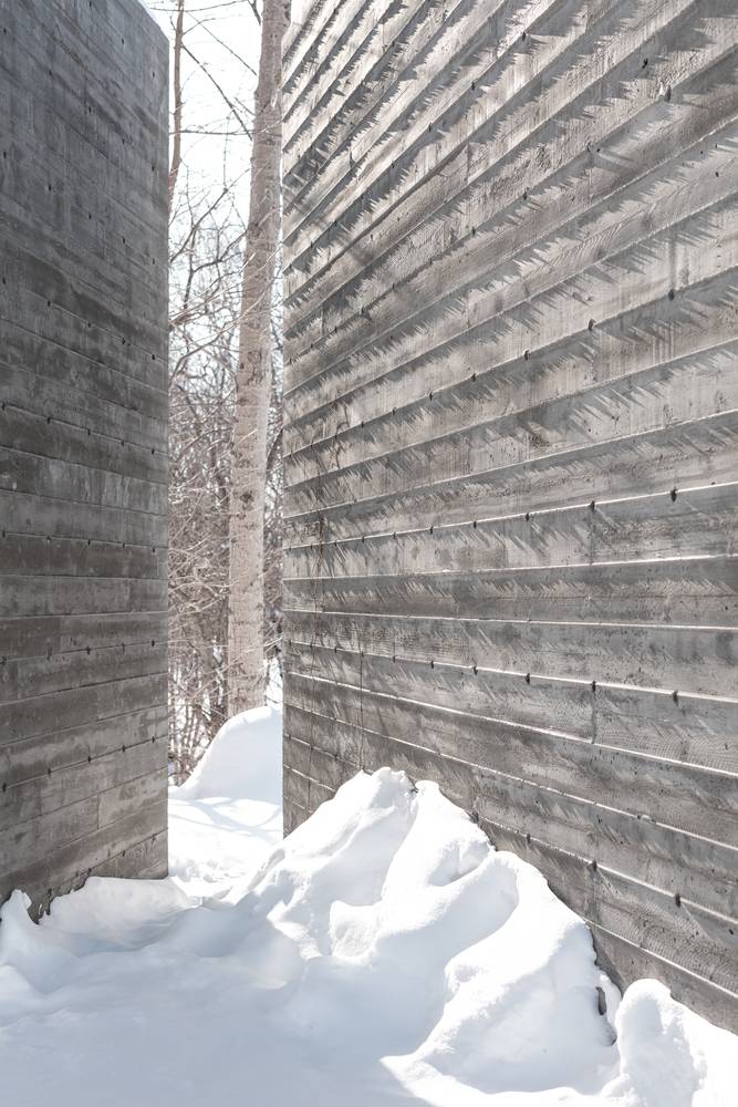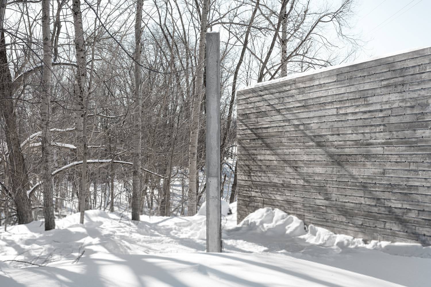 這兩塊給人強烈印象的實墻由混凝土澆筑而成,表面留有回收木材模板的印記。墻面上深淺不一的顏色,木質模板的線條與獨特的紋理組合出重寫本般層疊抽象的痕跡,如同特殊的語言符號,任由行人解讀。四季的輪回,雨水、落葉和積雪的交替,都會給混凝土墻面帶來微妙的變化,向行人講述一個不斷更新著的故事。