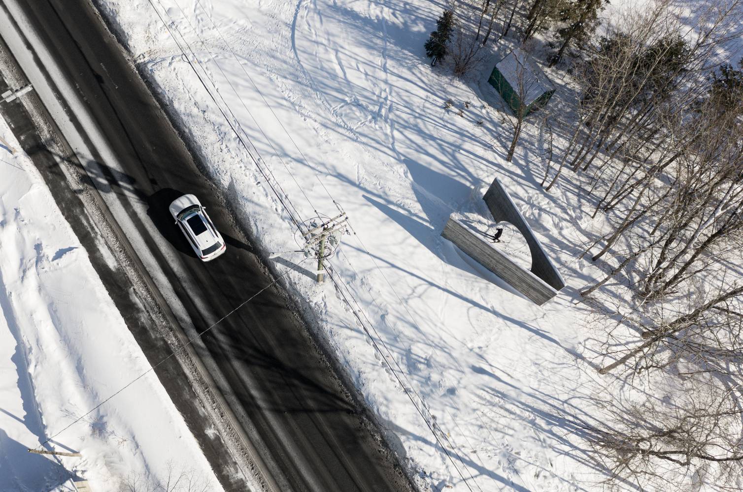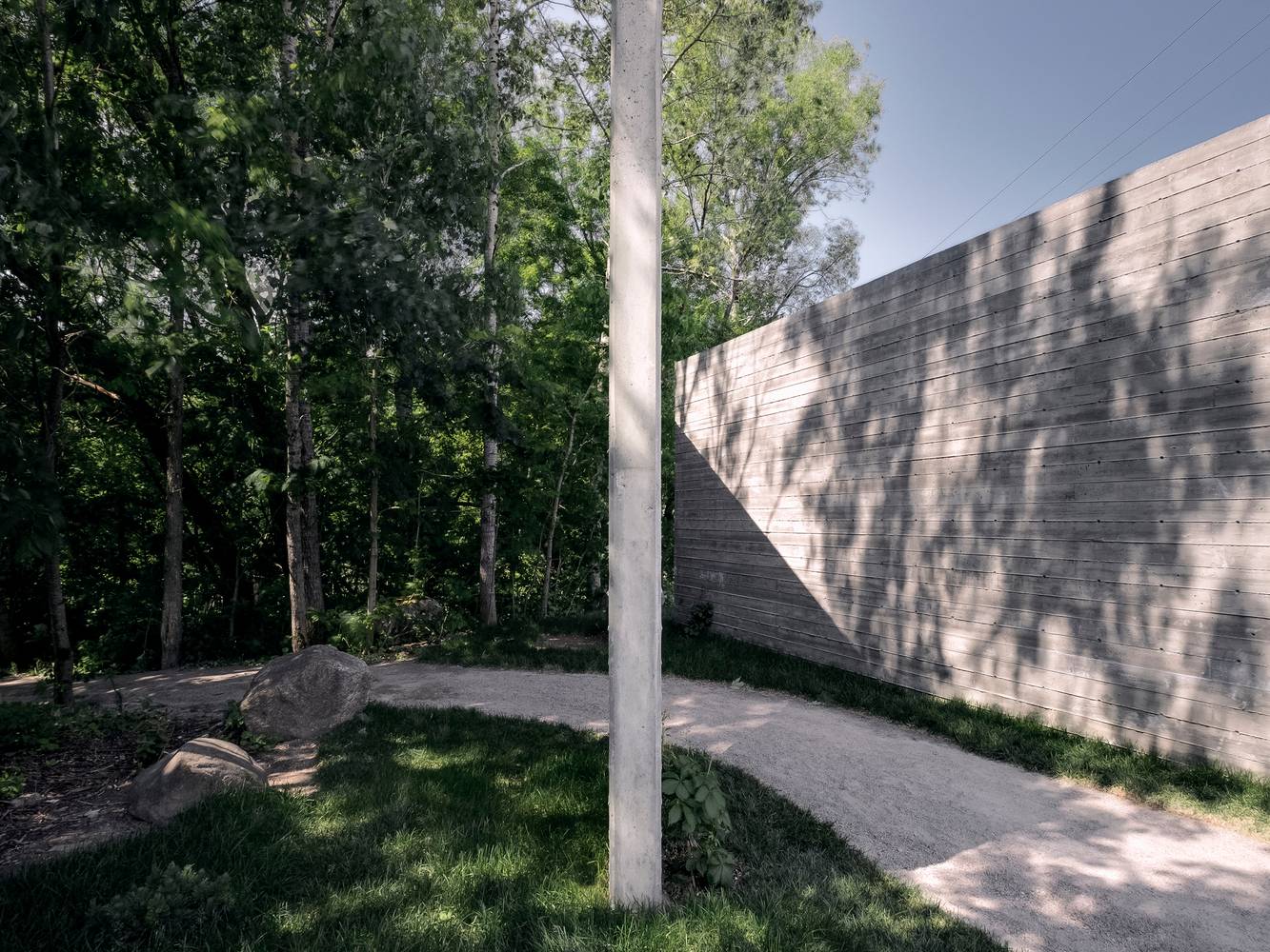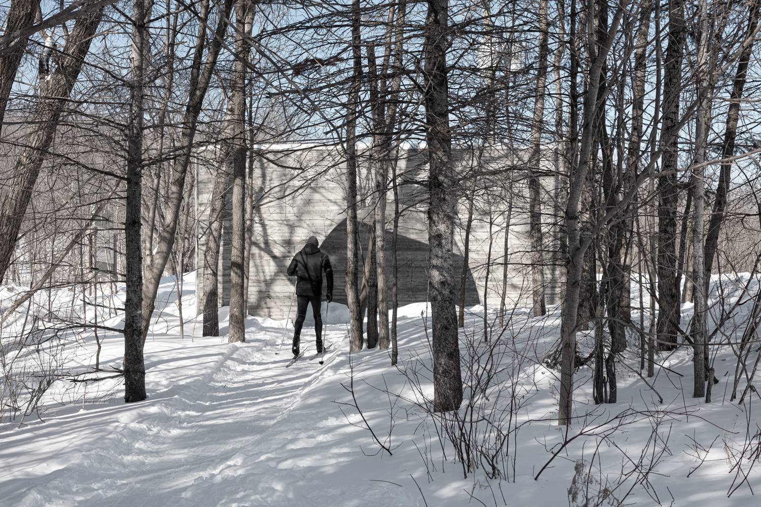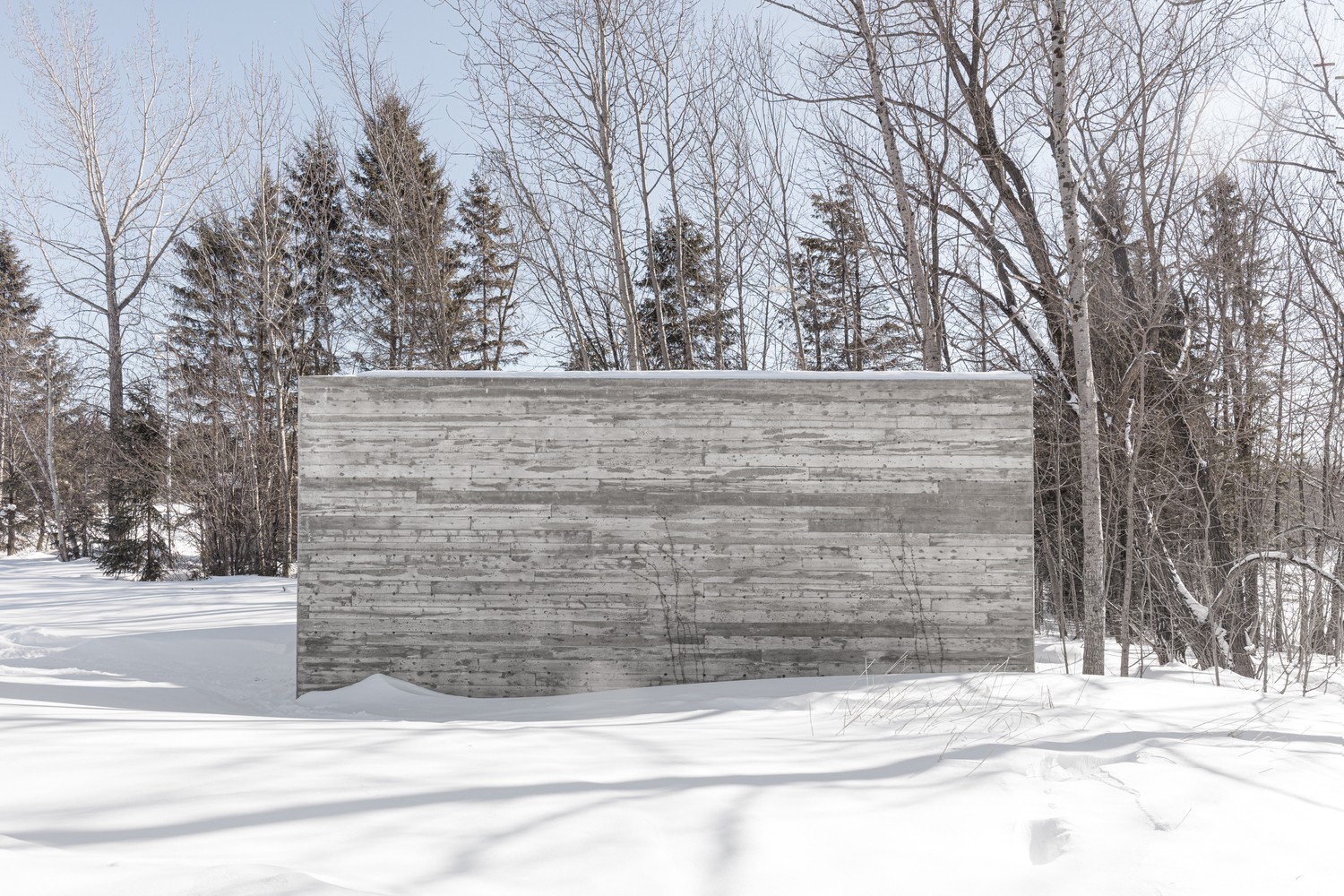 這兩塊給人強烈印象的實墻由混凝土澆筑而成,表面留有回收木材模板的印記。墻面上深淺不一的顏色,木質模板的線條與獨特的紋理組合出重寫本般層疊抽象的痕跡,如同特殊的語言符號,任由行人解讀。四季的輪回,雨水、落葉和積雪的交替,都會給混凝土墻面帶來微妙的變化,向行人講述一個不斷更新著的故事。