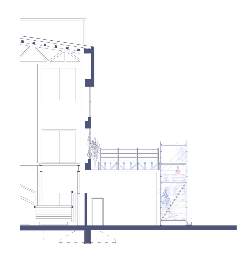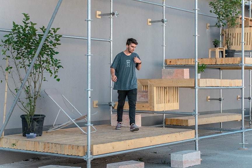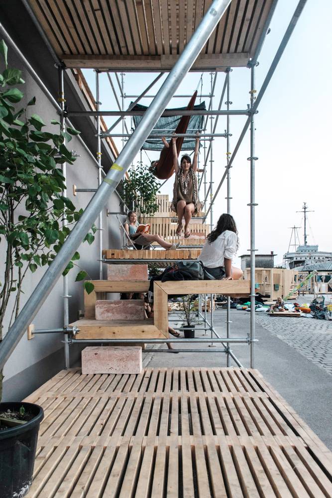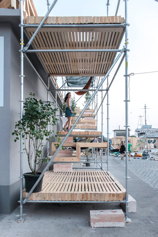 這個(gè)裝置是在一個(gè)名為 Export Drvo 的50年代工業(yè)倉(cāng)庫(kù)的擴(kuò)建基礎(chǔ)上建造的,從街道開始,上升幾層之后,到達(dá)現(xiàn)有屋頂上的一個(gè)高架露臺(tái)。每一層都形成了一個(gè)親密而又相互聯(lián)系的空間,可以讓小群體聚集在一起,同時(shí)提供了一個(gè)公共的臨街空間,讓人們意識(shí)到 Export Drvo 建筑正在進(jìn)行的文化更新。這種再生是以適應(yīng)性再利用的形式呈現(xiàn)的,作為對(duì) Rijeka 市無視工業(yè)遺產(chǎn)的一種反應(yīng)。 作為一個(gè)曾經(jīng)繁榮的海港和工業(yè)中心,今天的城市充斥著廢棄的工業(yè)建筑,這釋放了城市發(fā)展的潛力。露臺(tái)上的一個(gè)凸起的平臺(tái)為小型集會(huì)提供了演講空間,觀景臺(tái)則向上延伸,讓人們可以眺望遠(yuǎn)處的城市。