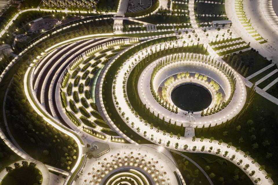 公園設(shè)計(jì)從視覺(jué)和功能上延續(xù)了足球場(chǎng)環(huán)形流線的概念,如螺線層層展開(kāi),打造出一座充滿活力的現(xiàn)代化景觀公園。園內(nèi)道路連綿起伏,貫穿融為一體的體育、活動(dòng)和休閑區(qū)域,其中包含大型的坡道和階梯廣場(chǎng),同時(shí)可作為舞臺(tái)演出及電影放映的看臺(tái),還有一座露天劇場(chǎng)和一個(gè)在冬季可變身為溜冰場(chǎng)的親水廣場(chǎng),園內(nèi)設(shè)有齊全的游樂(lè)運(yùn)動(dòng)設(shè)施,包括全俄羅斯最現(xiàn)代化的滑板公園之一。公園中央設(shè)有一座螺旋山丘,將行人引至高處的瞭望點(diǎn)。