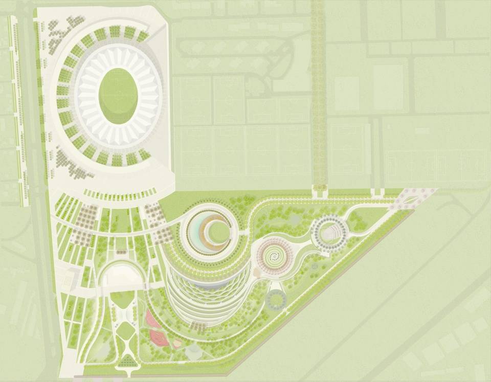 ▲淺色道路與體育場(chǎng)建筑的材質(zhì)色調(diào)一致