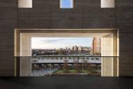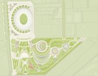 公園內(nèi)的道路與小型建筑均采用淺色天然石材,與體育場(chǎng)建筑的材質(zhì)色調(diào)一致,從而使兩者和諧地相融。環(huán)形公園同時(shí)承擔(dān)了體育場(chǎng)運(yùn)營(yíng)的后勤功能,山坡地形下容納了體育場(chǎng)的技術(shù)功能區(qū)及餐館、露臺(tái)劇場(chǎng)的洗手間和衣帽間等公共功能空間。園區(qū)內(nèi)高度差為6米,整體外高內(nèi)低,將周?chē)姓缆返男鷩锑须s擋在公園之外。林蔭大道往下緩緩延伸,人們?cè)诖藰O目遠(yuǎn)眺,將體育場(chǎng)和公園景觀盡收眼底。