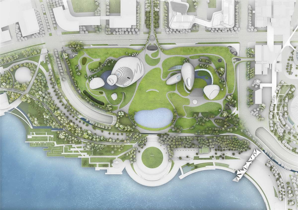 多功能公共空間串聯(lián)各展廳,核心活動(dòng)區(qū)域是中央廣場(chǎng)。這里可舉辦1萬人的大型活動(dòng)。鏡面水池倒映著城市建筑群,讓人流連;音樂噴泉增添了節(jié)日氣氛,水池中央的舞臺(tái)成為了絕佳的海濱劇場(chǎng),用于藝術(shù)裝置和雕塑展出的公共空間則可用來舉辦國(guó)際藝術(shù)節(jié)和交流展。
