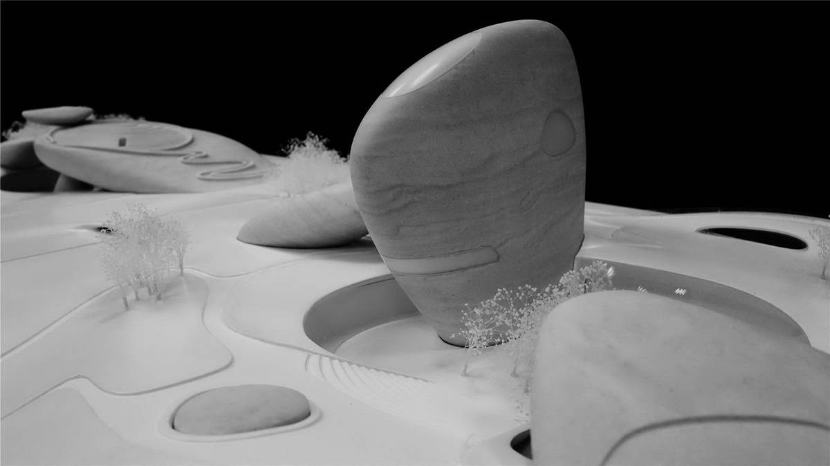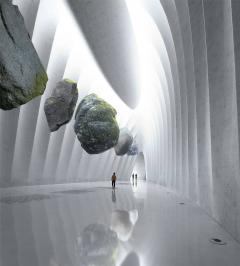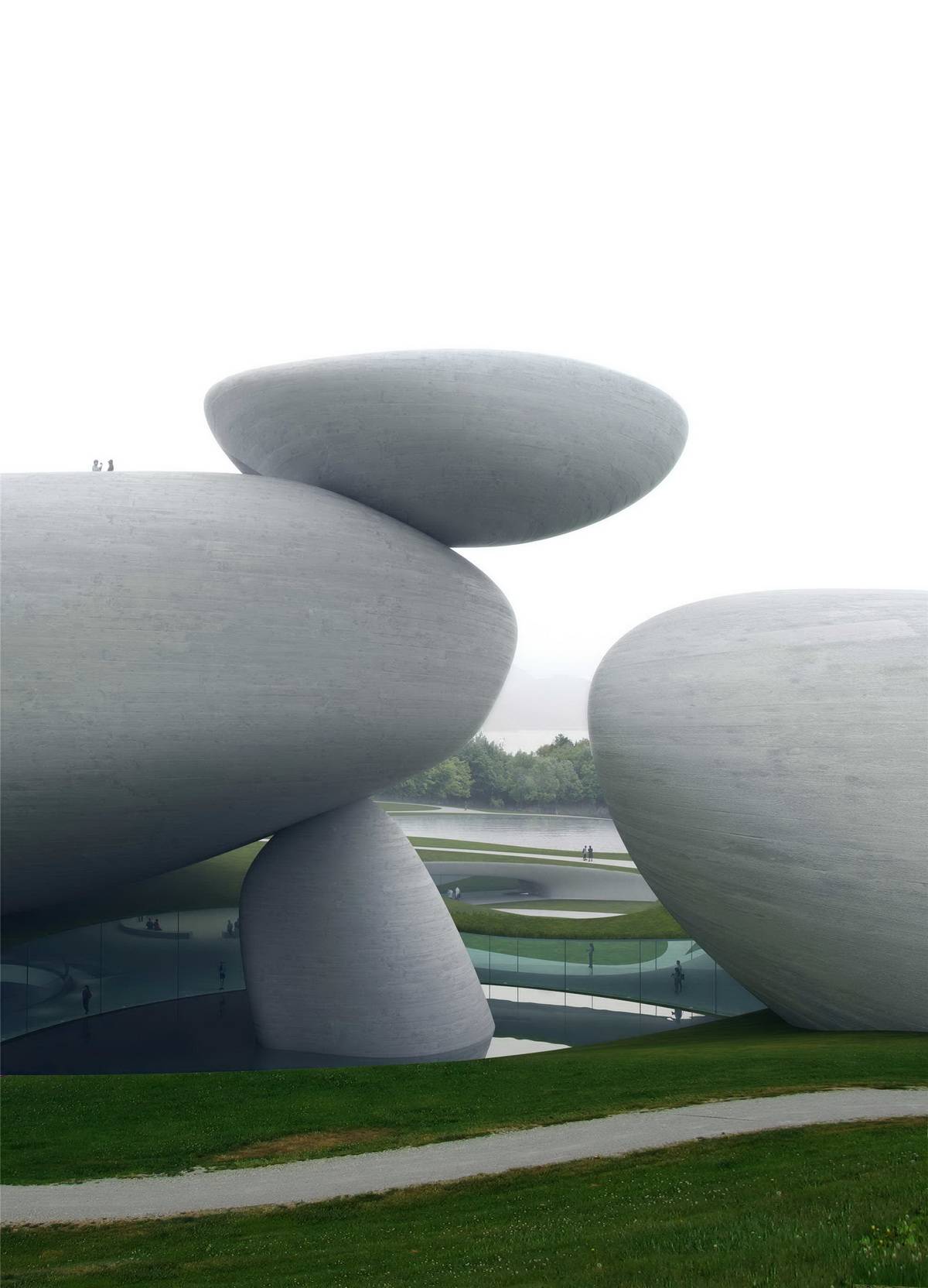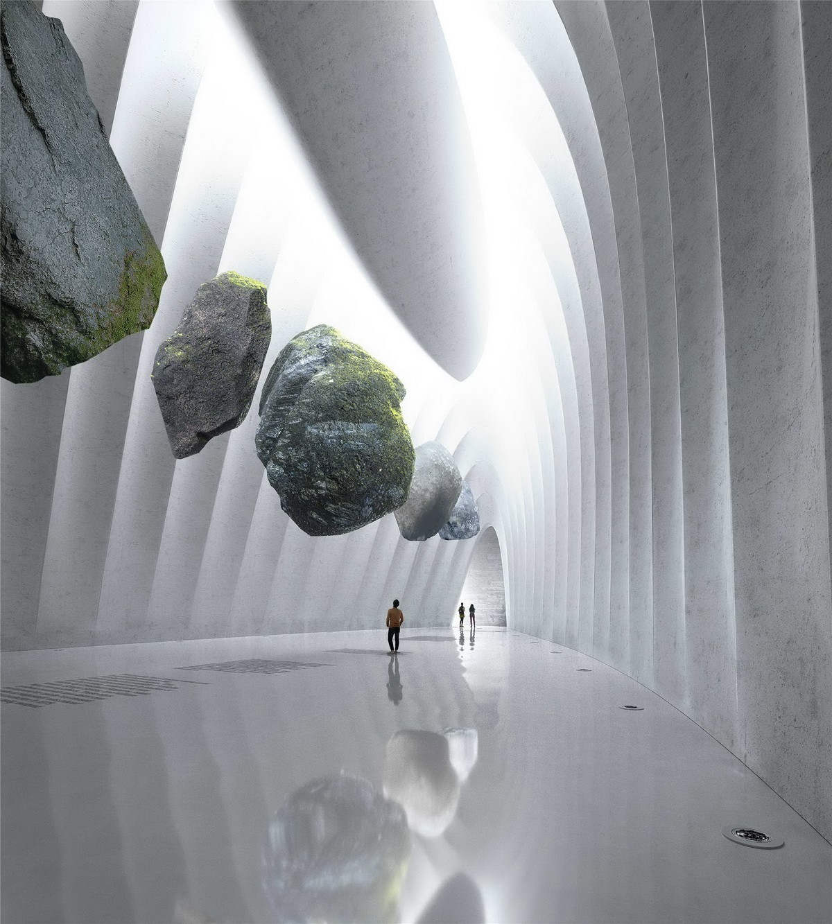 石群內(nèi)的特殊展廳是全館的點(diǎn)睛之筆。自然綠色覆蓋的屋面上,石頭落水而出。自然石形態(tài)的多樣性為室內(nèi)建筑空間提供了靈活且震撼的展覽空間效果。層高有30米,橫向的可一次容納3000平米的展覽面積。自然光在半隱半實(shí)的石頭中透入室內(nèi)。在橫向的石頭表面,有拾階而上的臺(tái)階,直登石頂。一個(gè)望天的精神空間鏈接著攀巖而上的曲徑。