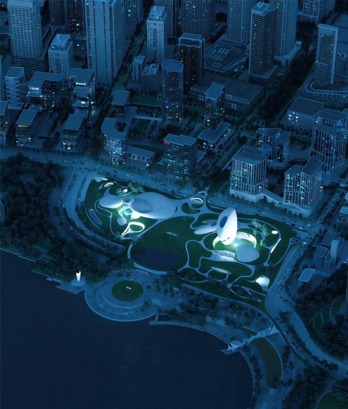 深圳灣文化廣場(chǎng)位于深圳南山區(qū)的后海中心海濱,這里是近十年來飛速發(fā)展的經(jīng)濟(jì)新區(qū)和世界科技創(chuàng)新的集合點(diǎn)。整個(gè)項(xiàng)目由屋面覆土廣場(chǎng)、地景建筑以及地下公共展覽空間三部分組成。項(xiàng)目總占地面積約9.7萬平方米,MAD設(shè)計(jì)的南北展館建筑群——深圳創(chuàng)意設(shè)計(jì)館和深圳科學(xué)生活館——占地約5.1萬平方米,總建筑面積為18.2萬平方米。其中的創(chuàng)意設(shè)計(jì)館位列深圳“新十大文化設(shè)施”之一。