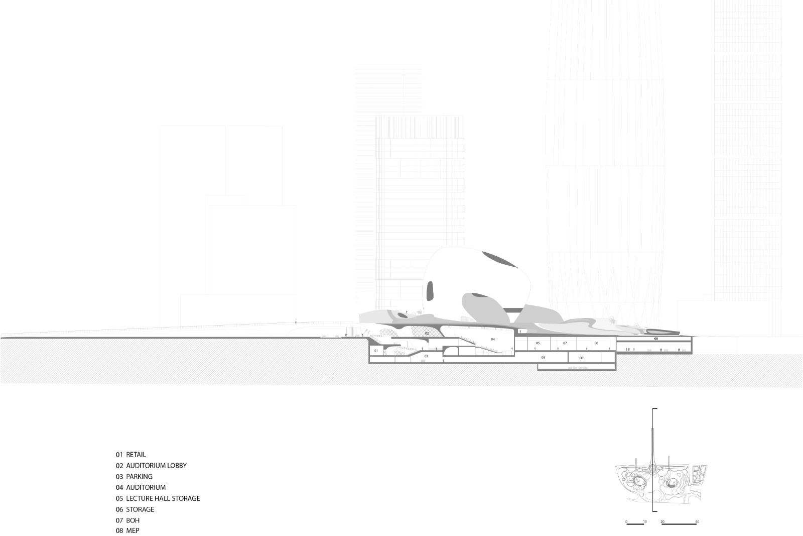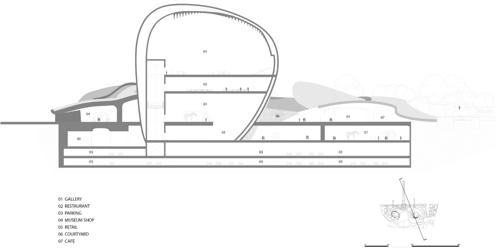 教育區(qū)橫跨兩層,連接一樓入口廣場(chǎng)和海灣通道。兩個(gè)地下展館公共空間從北向南相連,建筑師充分利用綠坡下的大尺度空間,結(jié)合商業(yè)及餐飲服務(wù)設(shè)置激活展館。