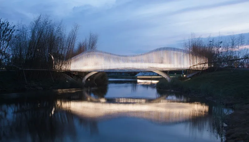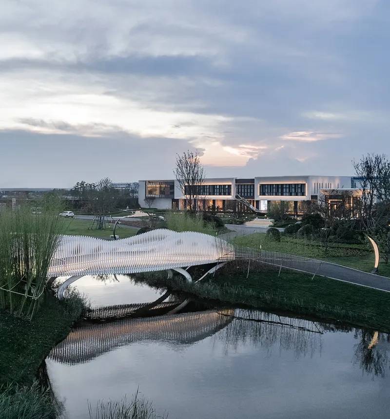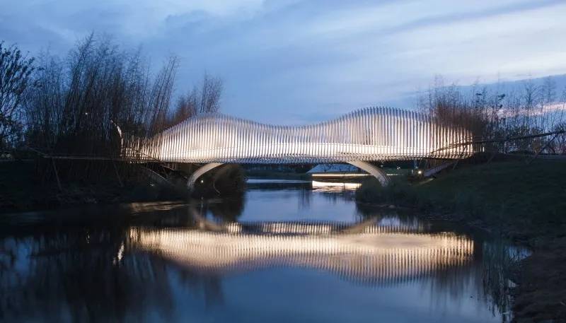 移步至浮光之橋,流光的橋身靜靜地倒映于水中,造型上采用金屬材質,彎曲的鋼肋骨沿著橋身創(chuàng)造了此起彼伏的形狀,造型別致。橋身猶如卷起水面的波浪,形成科技感的流光隧道,給人視覺上的沖擊,充滿未來感。
