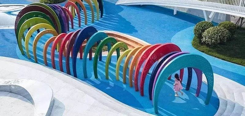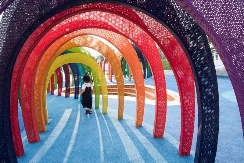 彩虹色的隧道影影綽綽地落在地面上,孩子在彩色的時光里游走嬉戲。穿越彩虹隧道,由地面向空中緩緩彎曲延伸的橋梁,在森林中,在彩虹間,在云朵下穿梭游走。