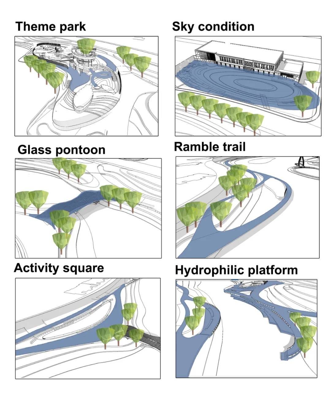 設計場地按照功能主要劃分為六位功能為一體的生活休閑景觀平臺,六大功能板塊分別為:兒童活動空間、休閑活動空間、濱水漫步空間、親水平臺空間、浪漫花??臻g、浪漫活動空間,構成宜居的休閑生活空間景觀平臺。
