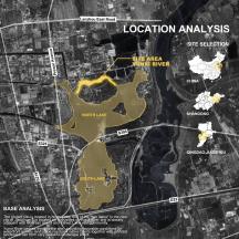 項目基地位于膠州少海新城主體框架上“兩湖”之一的北湖,坐落于云溪河兩岸,與觀瀾洲和森林湖別墅區(qū)緊密相連?;匾郧鄭u膠州城市規(guī)劃發(fā)展戰(zhàn)略為背景,在云溪河畔利用河道打造附屬于濱水生態(tài)社區(qū)沿河道蔓延的多元休閑活動親水岸線,營造簡潔大氣的空間氛圍。