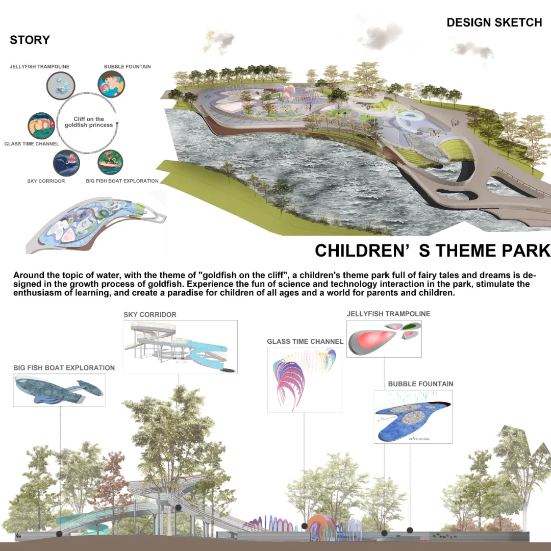 走出流光隧道,游至孩童的世界,蔥郁的森林環(huán)繞著兒童游戲的天地,這片童話天地圍繞水的話題而展開。以“懸崖上的金魚姬”為主題,將金魚姬的成長過程設計成夢幻的兒童主題樂園。在樂園中體驗科技互動的樂趣,激發(fā)學習的熱情,打造全齡的兒童樂園,親子成長的基地。