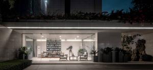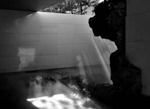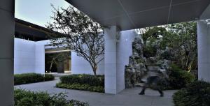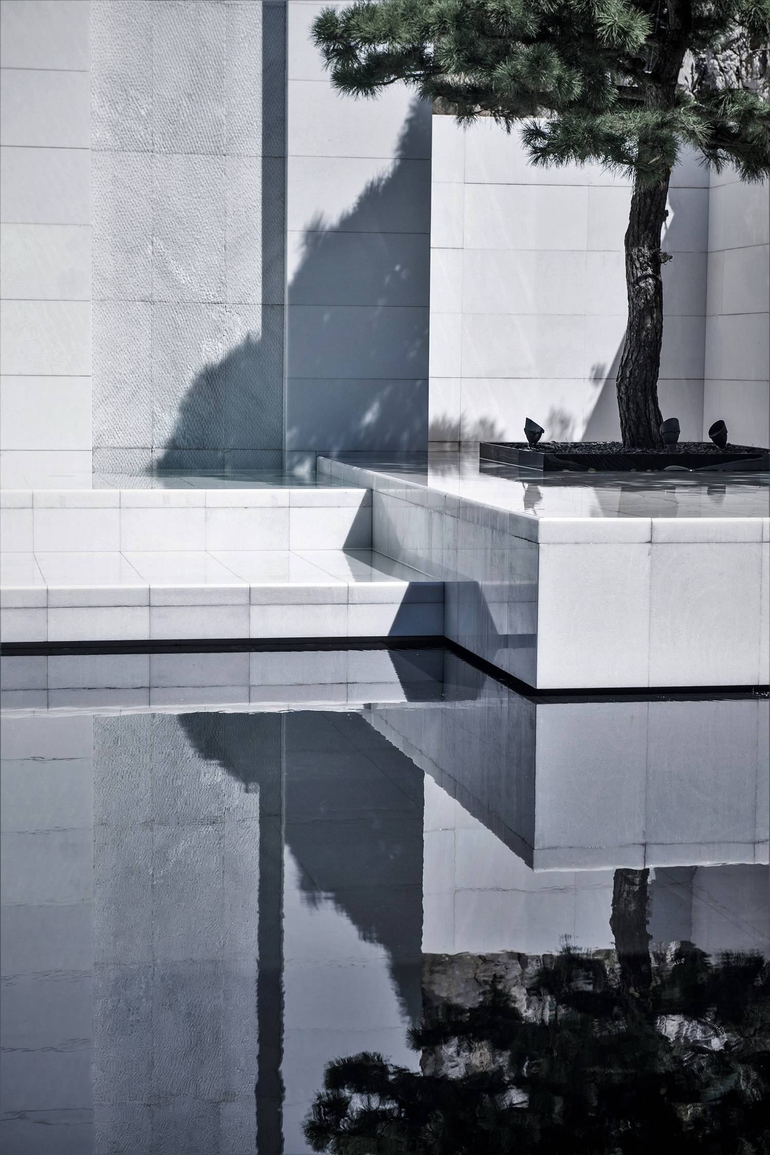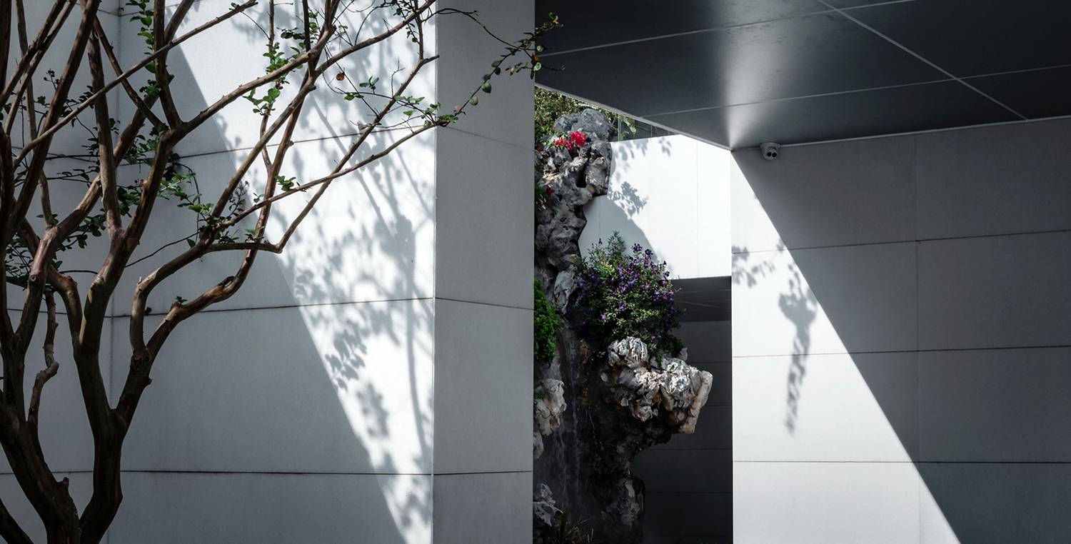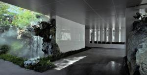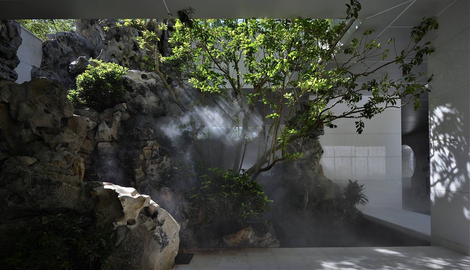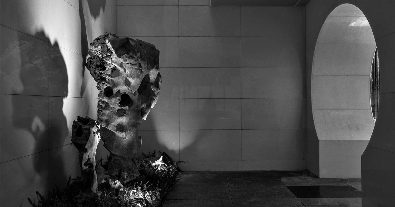 The sculptural stone stands still and the light pours through the moon gate into the corridor, allowing people to feel totally at ease in this quiet and peaceful space.