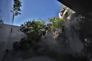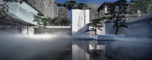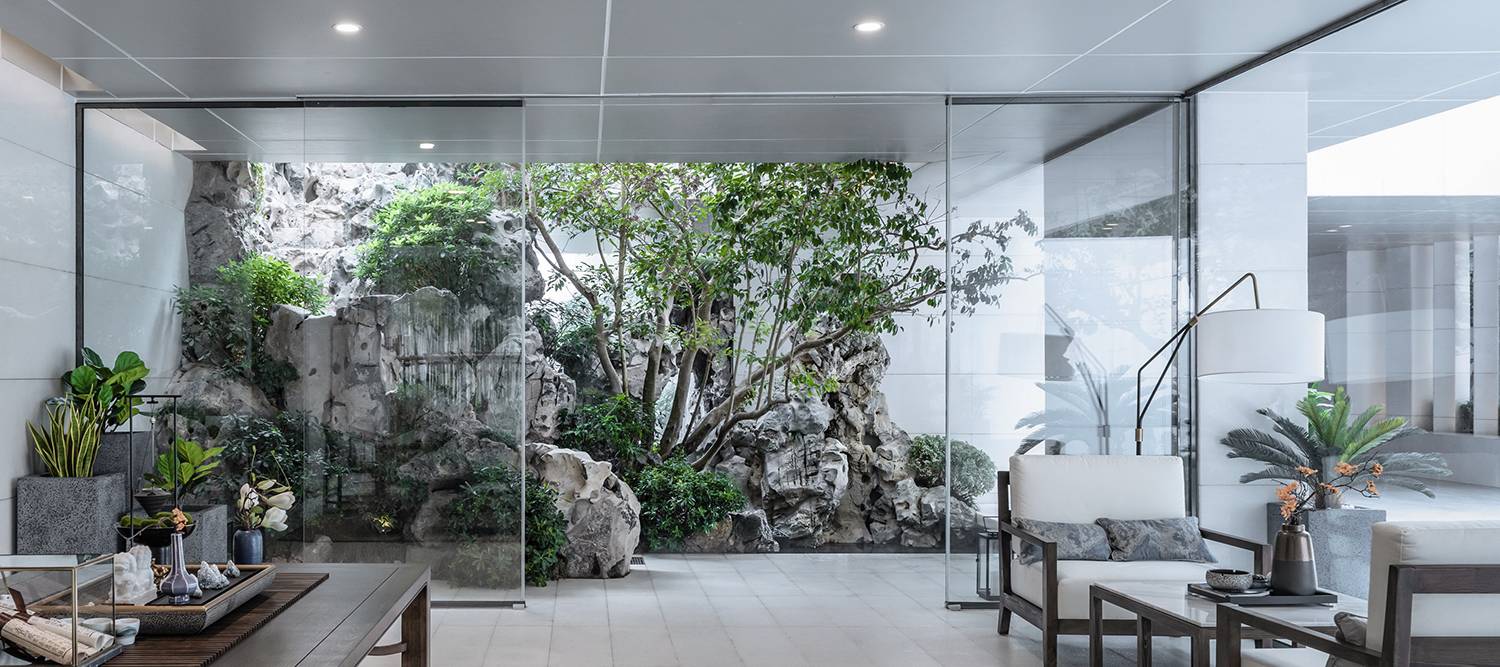 Decorative elements such as the pine, rough stone and white rocks are carefully selected to avoid too much interference in the space. Materials of different texture and size are employed to present a pure natural space.