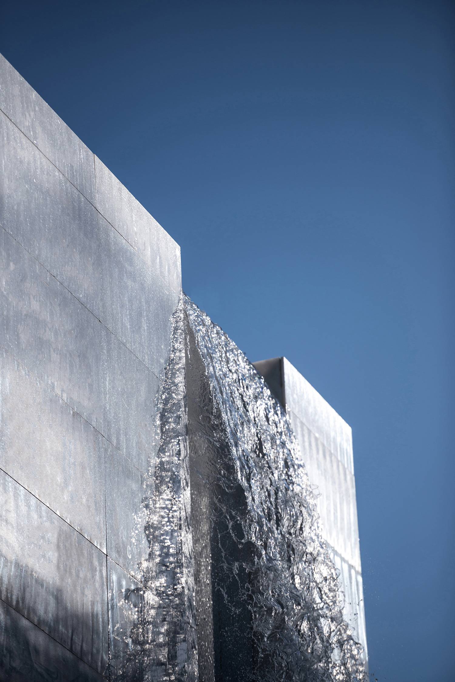 借鑒山水畫的創(chuàng)作理論,設(shè)計師有意營造一條立體游線,以重現(xiàn)人在山水環(huán)境中的體驗感。先是在光影游廊穿越;在游廊的盡頭仰望天際;步上登高平臺時,視線逐步抬升;最后到達登高平臺,實現(xiàn)無限眺望。