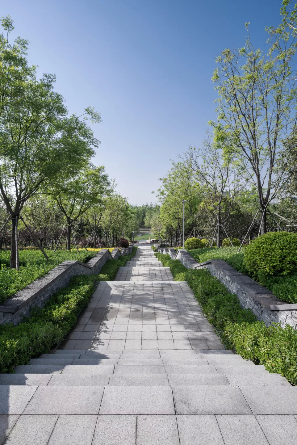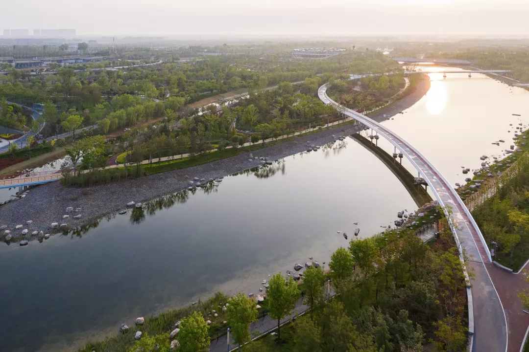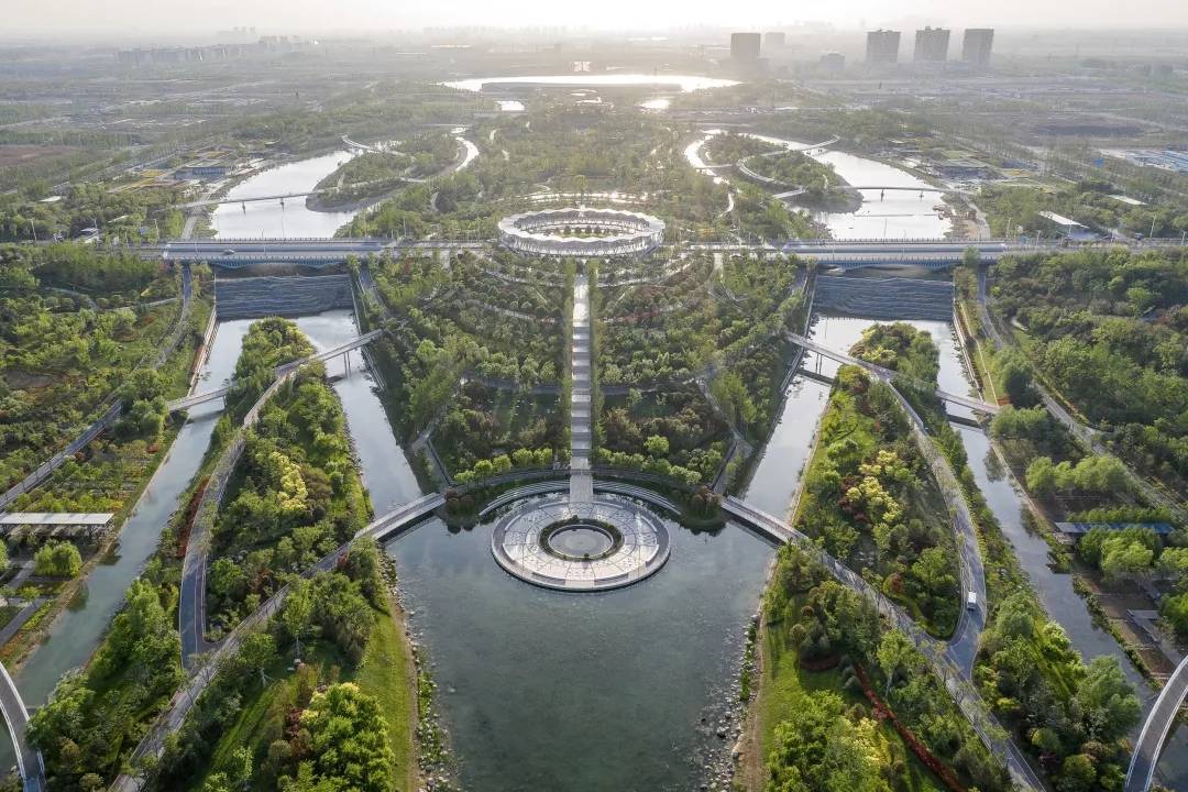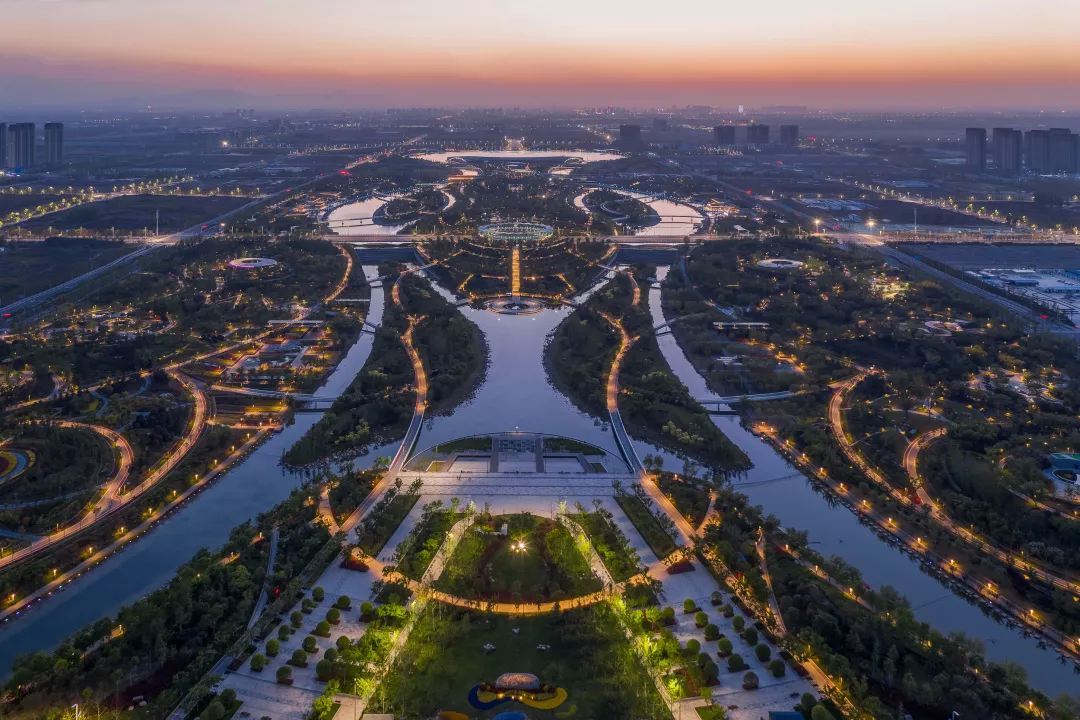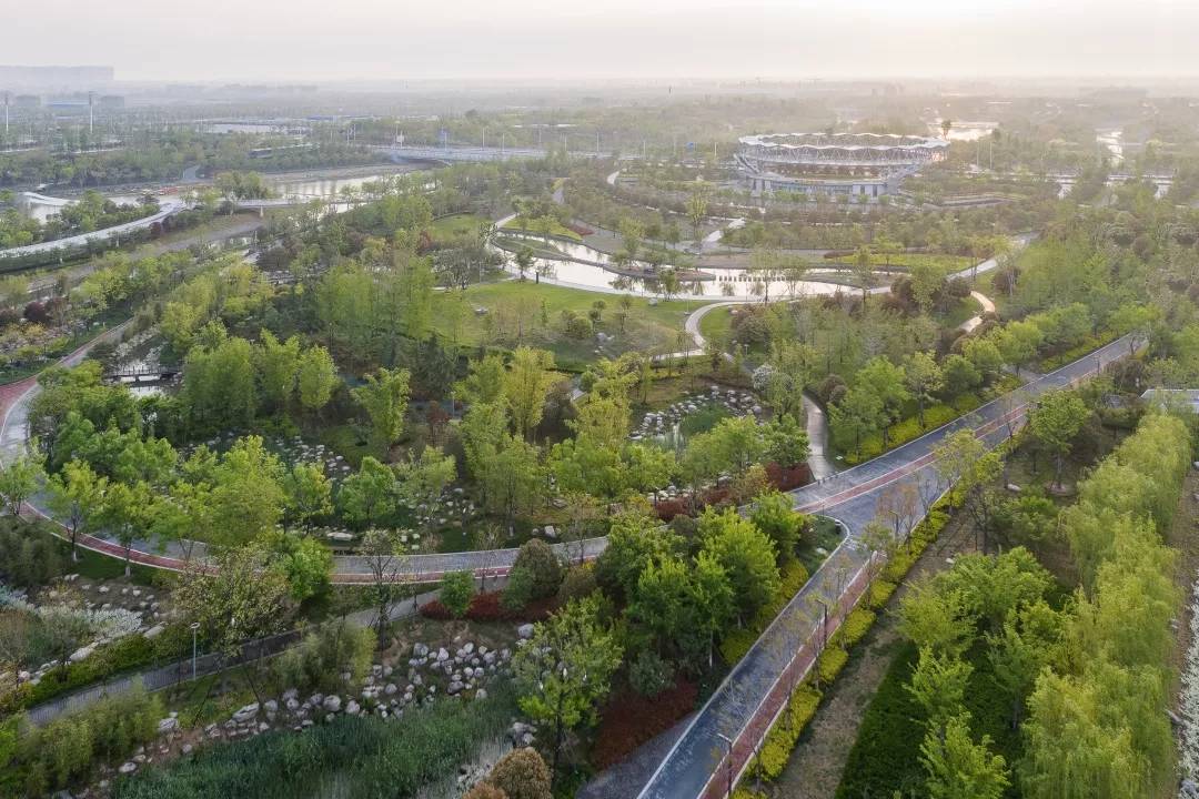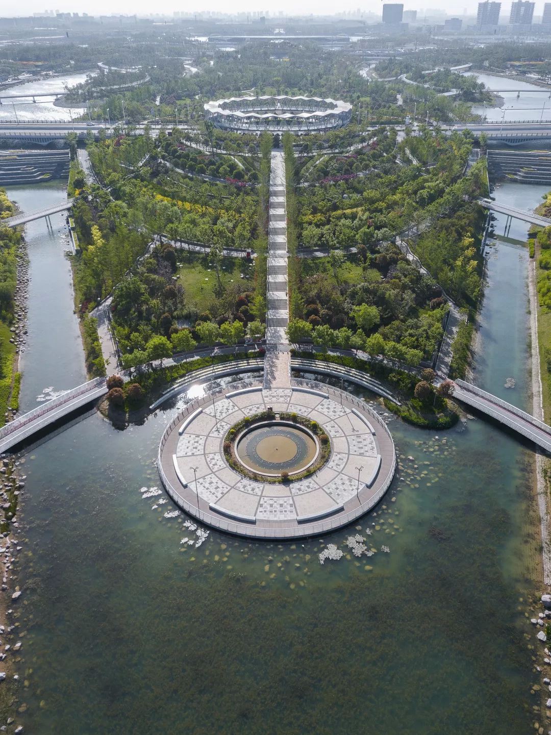 位于鄭州航空港區(qū)的雙鶴湖中央公園(一期)占地面積約150公頃,該公園同時為第十一屆中國國際園林博覽會(鄭州)的B展區(qū)。雙鶴湖中央公園景觀設(shè)計強(qiáng)烈的中軸秩序,結(jié)合垂直生長的豎向空間層次,軸線明確、大氣疏朗,是一個有機(jī)生長的彰顯中原特色的城市中央公園。
