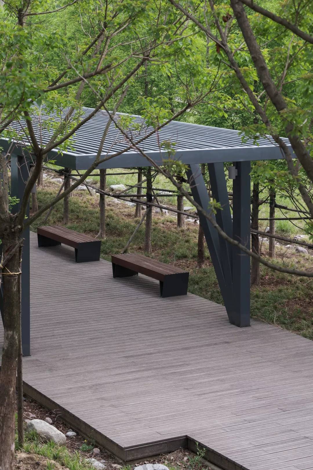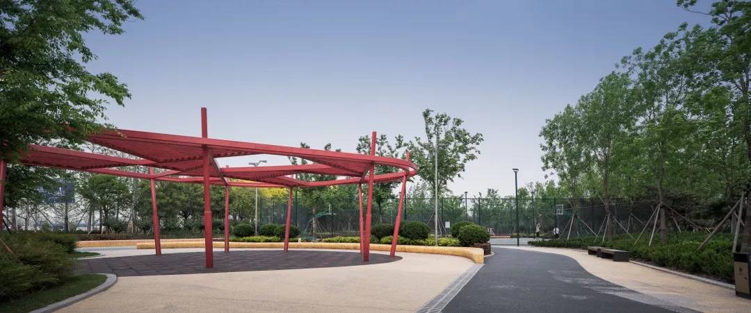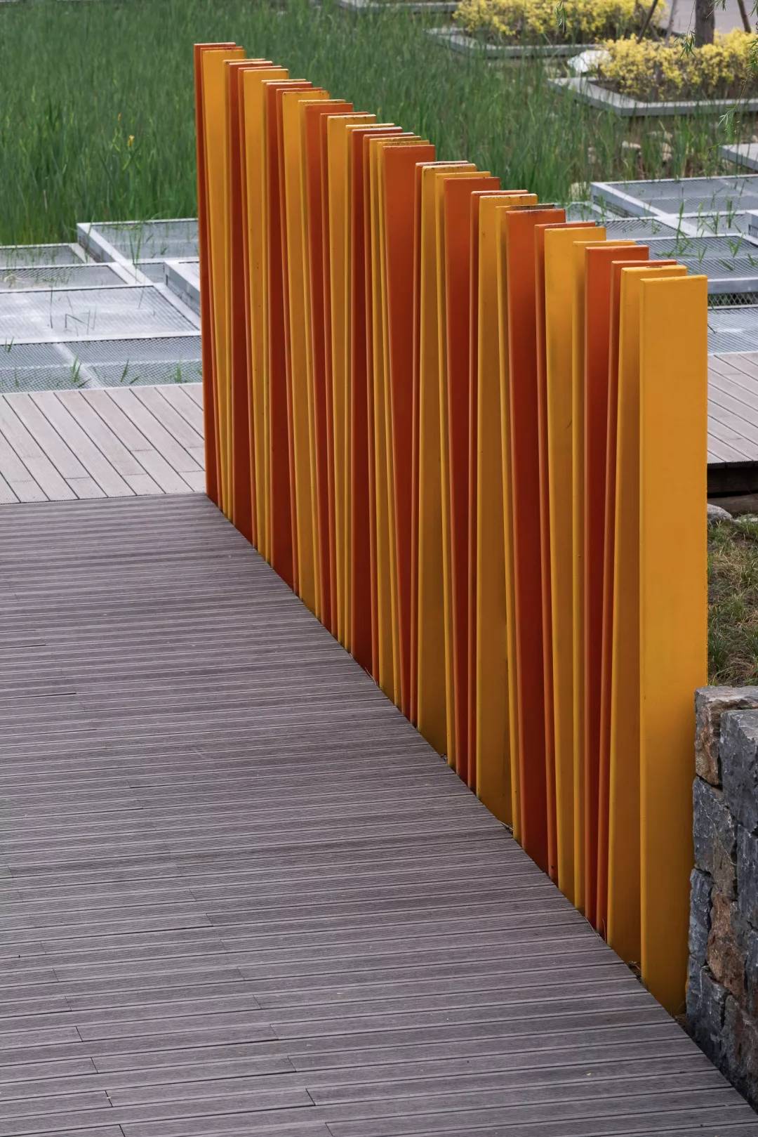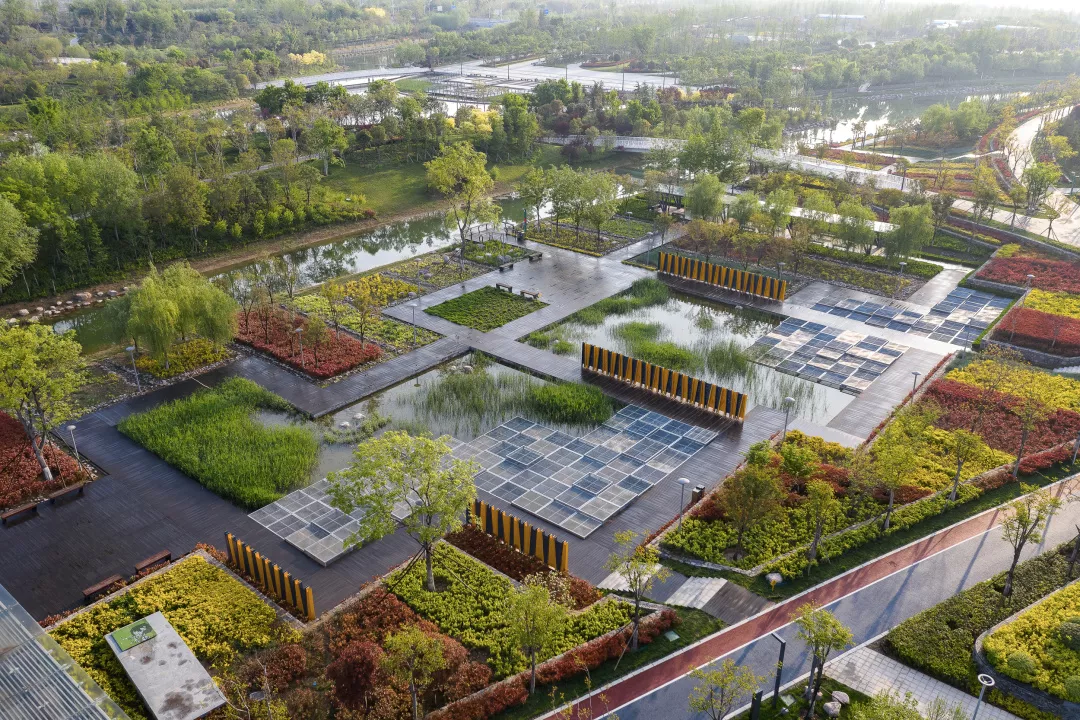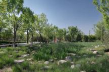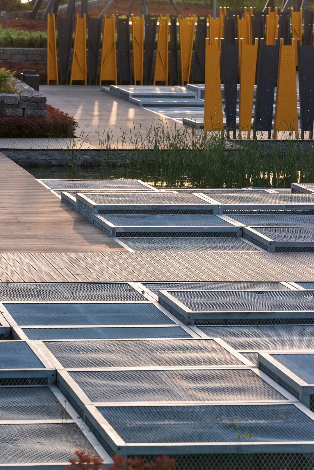 陸偉宏: 在規(guī)劃設(shè)計階段我們也應(yīng)用了很多在當(dāng)時剛剛提出的新理念比如海綿城市、生態(tài)城市等。具體來說我們在公園中大量使用了透水性鋪裝材料,同時設(shè)計大量的雨水花園、濕地、生態(tài)駁岸、植草溝、綠色屋頂?shù)群>d城市設(shè)施。