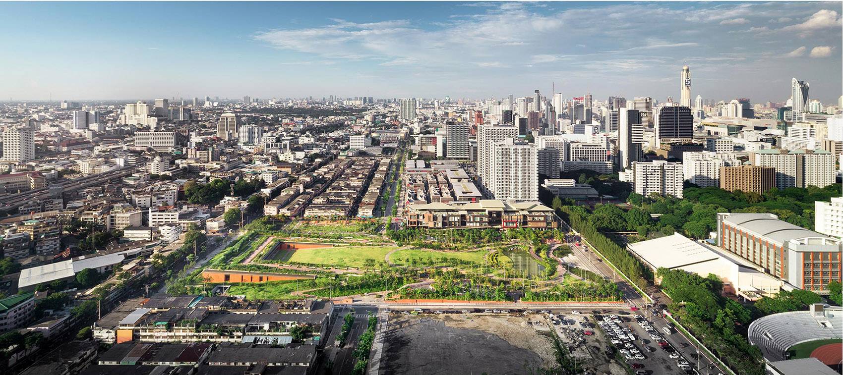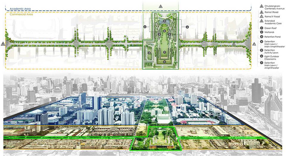 朱拉隆功百年紀念公園所在的場地坐擁11英畝的土地和1.3公里長的道路,是曼谷商業(yè)中心的一塊價值7億美元的昂貴區(qū)域。尤其寶貴的是,在曼谷持續(xù)30年的迅速發(fā)展下,這里并未被改造成購物商場或辦公樓,而是成為了一個綠色的公園。2012年,朱拉隆功大學(xué)發(fā)起了公園的設(shè)計競賽,旨在于學(xué)校成立100周年(2017年)前夕將校園的綠地奉獻給大眾以示其對社會的回饋。