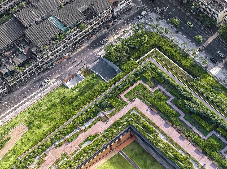 ▲泰國最大的綠色屋頂:公園的最高點設(shè)有全泰國最大的綠色屋頂,占地5200平方米。傾斜的屋頂能夠吸收雨水和徑流,并將其引向三個地下水箱、濕地以及公園低處的蓄水池。