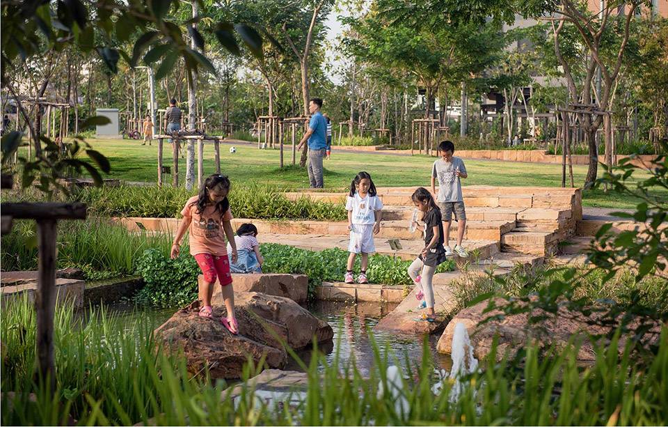 ▲城市里的第一個新公園露天劇場:公園的坡度不僅能夠起到輸送徑流的作用,還為市民們提供了曼谷第一個城市尺度的露天劇場。傾斜的草坪周圍環(huán)繞著建筑物,為音樂節(jié)等活動提供了理想的聲學(xué)效果。