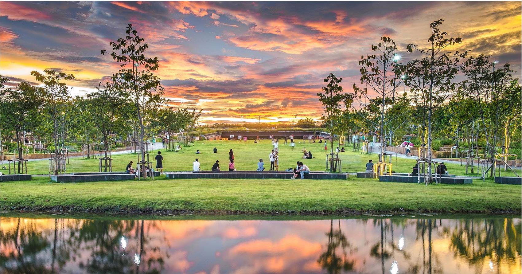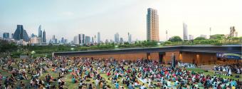 ▲攔洪草坪:公園的主草坪是一個寬廣的開放空間,能夠為各種活動提供靈活的空間,其中包括與朱拉隆功大學(xué)核心校園主軸線平齊的露天劇場。