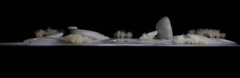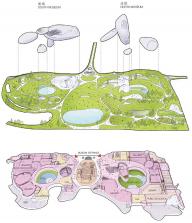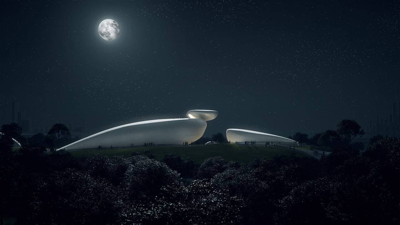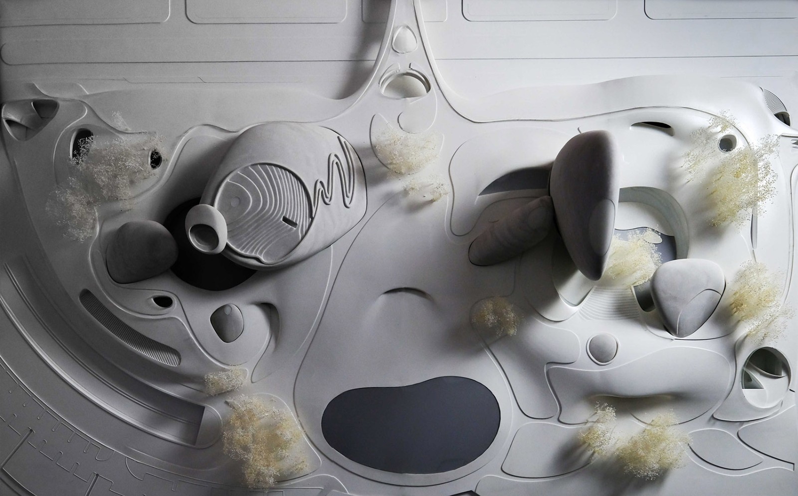 MAD的方案將較大體量的標準展覽空間、公共教育場地、圖書館、接待大堂、咖啡廳、配套商業(yè)等功能放置在首層并覆土,屋頂形成綠地與城市直接連接,構成這個區(qū)域面積最大的公園。順應建筑的曲線,屋頂坡度自然發(fā)展,柔和回落大地,接壤之處被設計成數(shù)個下沉庭院,高低相合,延綿不斷。