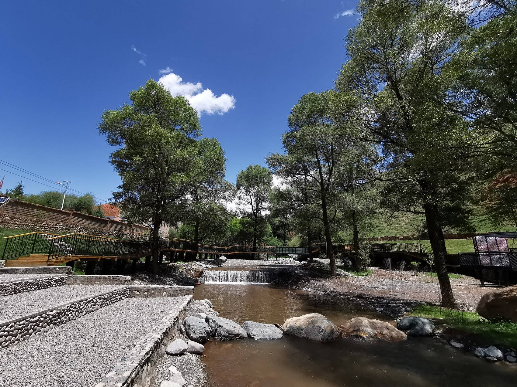 鄰里舒適場景建立在雪山匯集而成的溪流在西北高原彌足珍貴。設(shè)計(jì)希望抓住這片場地在退耕還草后的水環(huán)境再造機(jī)遇,重新構(gòu)建舒適的親水鄰里公共空間,采取理水以睦鄰的策略,針對現(xiàn)有水體進(jìn)行了三段集中整治,形成具有跌落感的開合水溪關(guān)系,以棧道曲折臨水穿于其間,借局部高差與林中成臺地通幽之感,力求狹長場地中的“小中見大”。林間步行系統(tǒng)也與村民廣場形成了公共生活核心區(qū)的小閉環(huán)交通,增加了復(fù)合性功能的親水公共活動場地,改善了周邊村民的可達(dá)性與居住環(huán)境,提升村莊的鄰里空間親水舒適性。