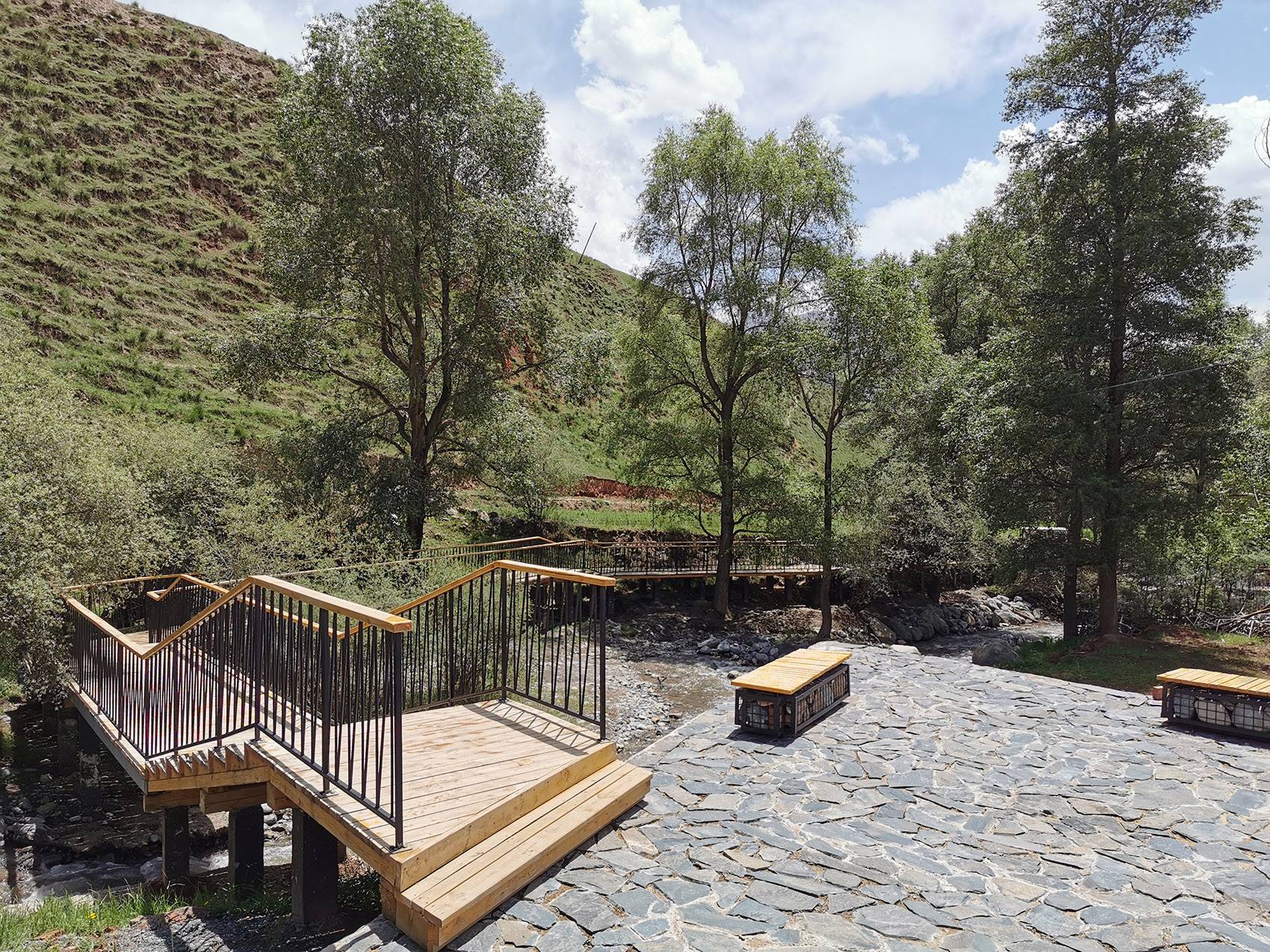 在思考白楊溝村公共空間的未來場景時,我們提出了“詩意自然、鄰里舒適”兩個層面的場景構(gòu)建。場景設(shè)計(jì)靈感源于傳統(tǒng)造園因借之法,以近乎消隱的棧道,從村口到白楊林再到青稞田旁打造了一系列展示龍鱗白楊的行望路徑,籍山林以造深景;時而橫臥跨水,時而蜿蜒入林,引人入勝于雪山溪流、白楊林間的秘境花園場景中。