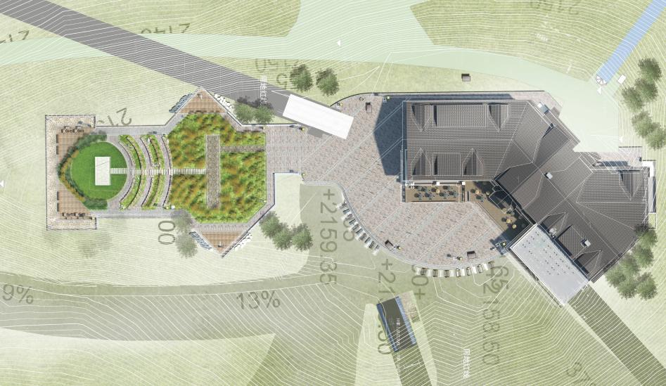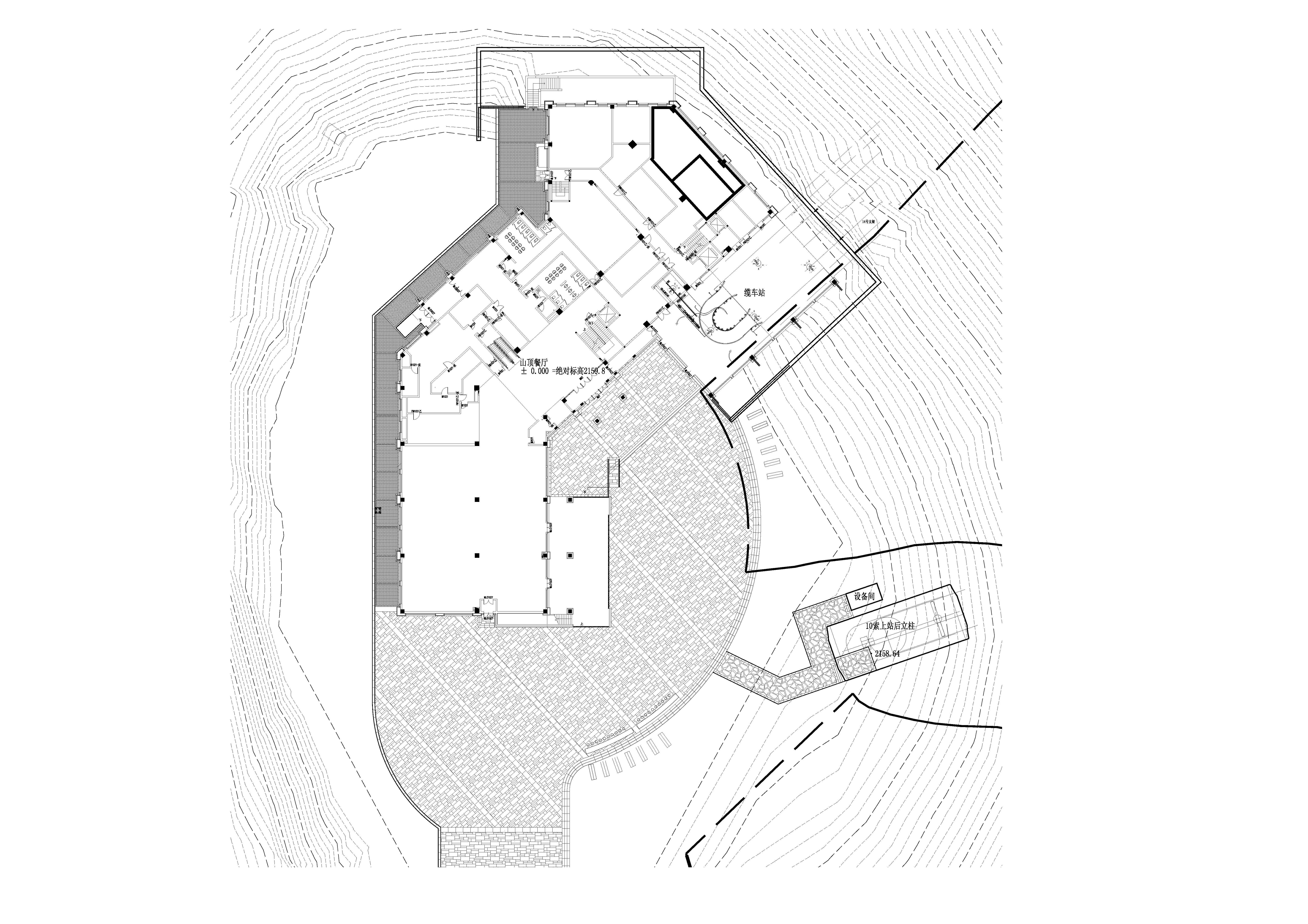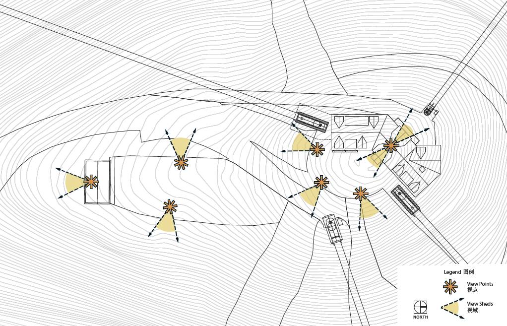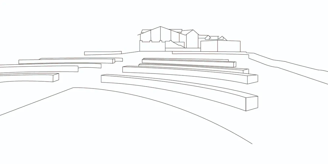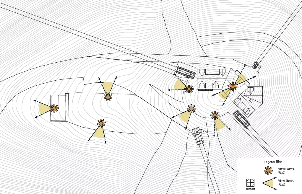 山頂視域開闊,處處是景色優(yōu)美的視點,360°全景呈現才能體現北方山脈的雋秀和延綿。因此我們設計了空間完全開敞的廣場和露臺,配合山地自身5米左右的自然高差,連接建筑與風景,連接自然與人。