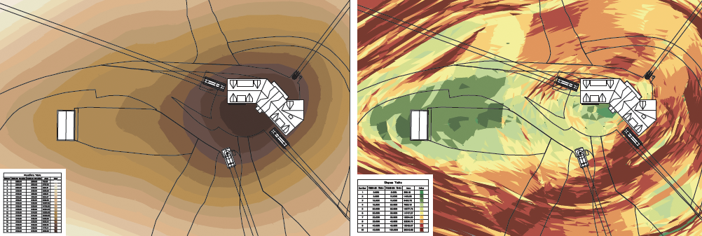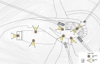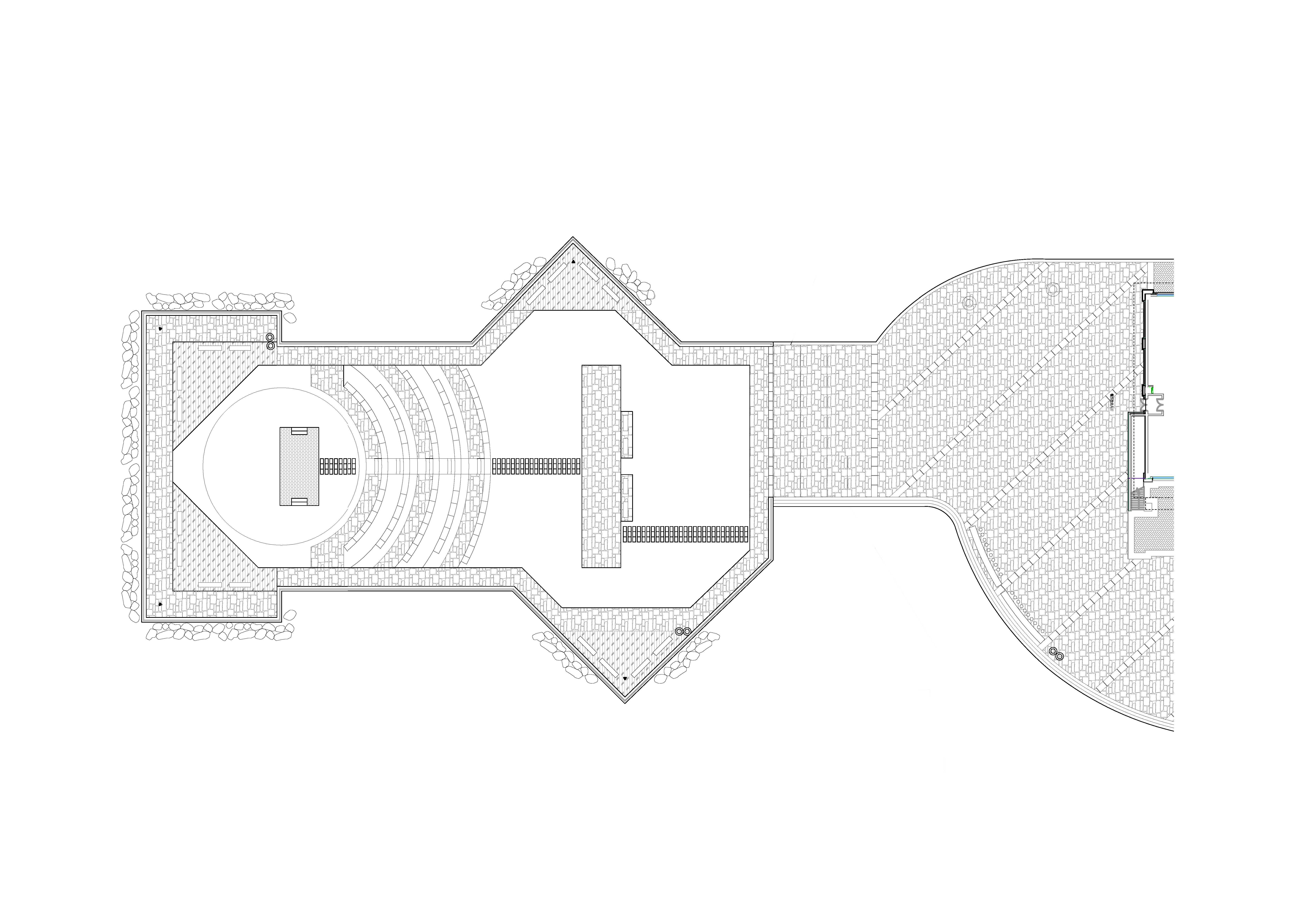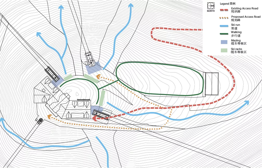 山頂廣場位于太舞滑雪度假區(qū)境內,纜車、雪道、山地自行車,當然還有徒步等多種方式皆可通達場地。到達山頂的過程和最終的路線對于使用者的空間體驗和印象非常關鍵,因此多種動線的交織就要求空間的綜合容納,保證所有區(qū)域和設施的可達性。而且考慮到雪季的使用,場地中需要保留一些“空白區(qū)”,以方便冬天雪地車的通行。