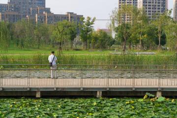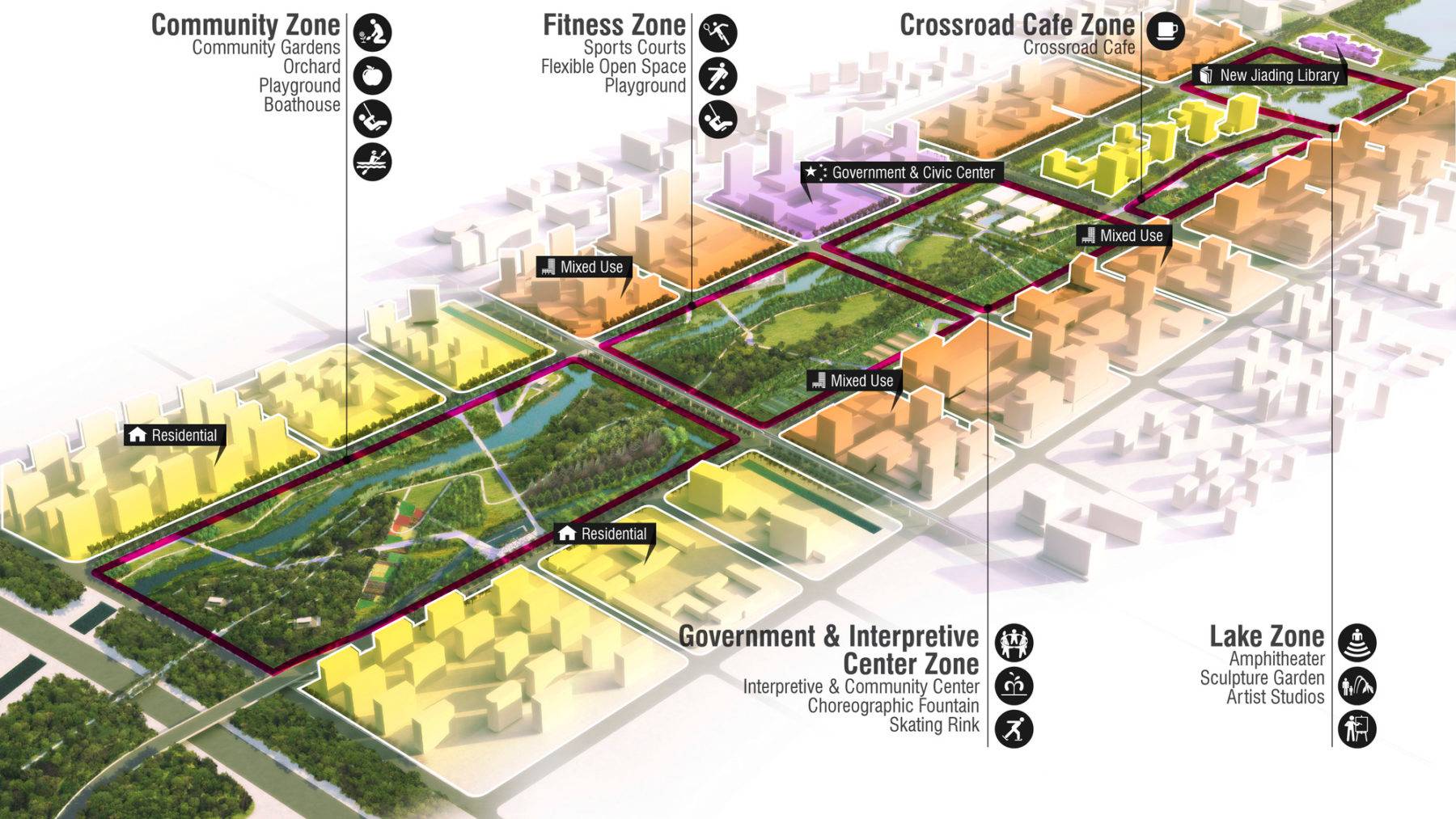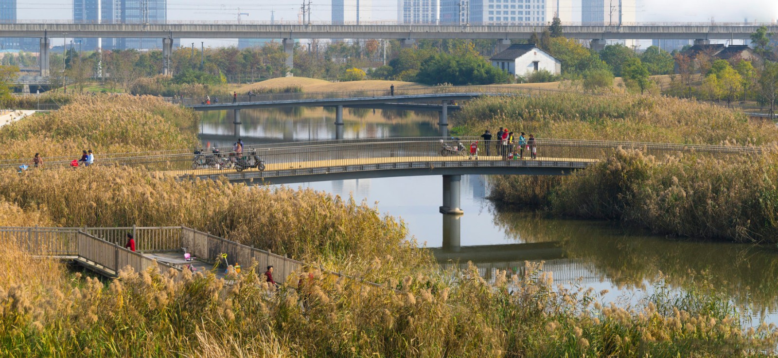 為了創(chuàng)建宜居城市,上海市嘉定區(qū)開辟了83公頃用地打造嘉定中央公園。這個城市公園不但為周邊街區(qū)提供各種景觀資源,更在這個急速發(fā)展中的區(qū)域里肩負修復(fù)自然系統(tǒng)的重任。公園建成前,其周邊的許多休耕農(nóng)地和廢棄工業(yè)建筑物已對區(qū)內(nèi)的水源造成了污染。來自美國的Sasaki設(shè)計事務(wù)所設(shè)計和構(gòu)建了整個公園的總體規(guī)劃(參看后附的Sasaki總景觀設(shè)計師及高級主管訪談)。該項目更獲得波士頓景觀設(shè)計師協(xié)會頒發(fā)的公園及康樂設(shè)施設(shè)計優(yōu)異獎。