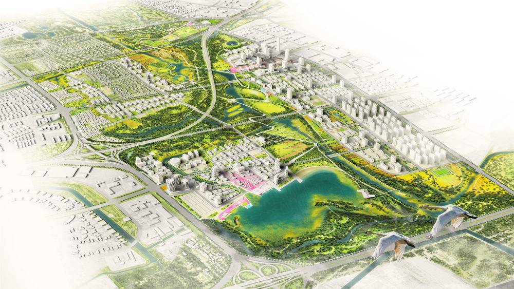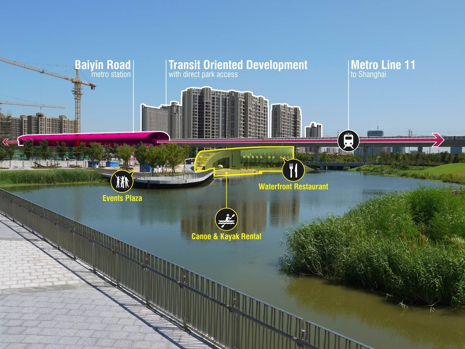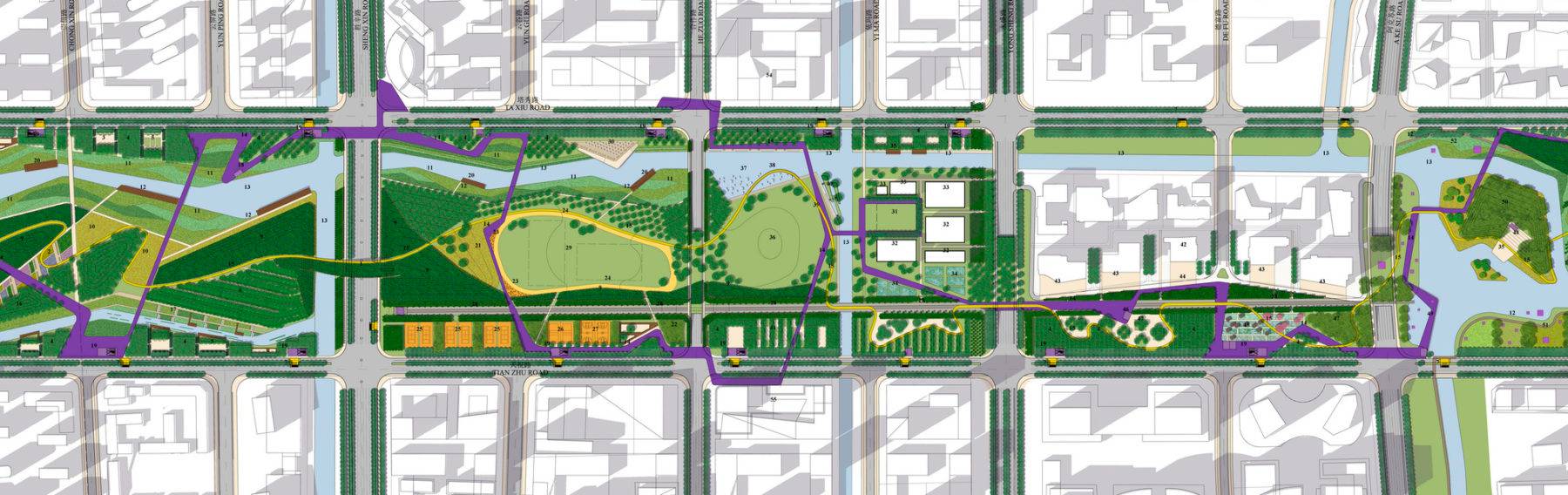 由于基地位于長江三角洲廣闊的范圍內(nèi),設(shè)計團隊認識到若上游地區(qū)不能實踐良好的水質(zhì)管理措施,將帶來影響深遠的不良后果,這正好表現(xiàn)了各個系統(tǒng)之間環(huán)環(huán)相扣的關(guān)系。數(shù)十年的人類活動完全改變了項目用地的生態(tài)機理,要恢復(fù)其原有的生態(tài)條件,團隊把公園構(gòu)想成一個生物過濾濕地系統(tǒng),使其成為大長三角地區(qū)其中一個功能部分。此外,欠缺周詳考慮的上位區(qū)域規(guī)劃里的九條馬路把項目用地分割得支離破碎。中央公園在建成后將成為一條綠色走廊,把分散的街區(qū)連接起來,并在其中融入周圍的景觀,促進野生動物和行人的活動。