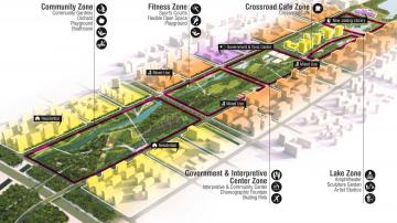 張韜:項目用地面積足有80多公頃,如此龐大的面積和尺度給了我們以多種不同的設(shè)計方法創(chuàng)造累積效益的機會。濕地或以階梯式排列,或以自然岸線呈現(xiàn)促進水源、植被和土地之間最大程度的互動,以達到最佳的濕地過濾效果。林地的設(shè)計方案分為兩類:有些地區(qū)強調(diào)呈現(xiàn)自然景觀,是提供分層棲息地的蔥郁森林環(huán)境;而其它地區(qū)則為林冠下盡量開敞通透的康樂休閑活動場地。