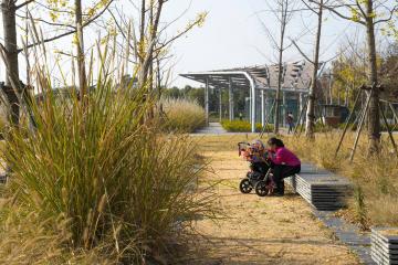 嘉定中央公園的設(shè)計引入了濕地和林地來打造分層棲息地。公園內(nèi)種植了約21,000棵區(qū)域鄉(xiāng)土物種的喬木和灌木,以支持濕地和林地環(huán)境的發(fā)展;種植長三角地區(qū)鄉(xiāng)土物種有助于豐富公園的生物多樣性,降低維護需求,同時使公園成為廣域水文系統(tǒng)的功能組成部分。設(shè)計團隊刻意在部分濕地和林地區(qū)域栽種特別挑選的幼苗,并限制這些區(qū)域內(nèi)的人類活動,目的是為了能更有效地控制自然環(huán)境的保育過程,讓基地有更大的機會以自然的方式恢復(fù)其生物多樣性。
