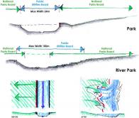 設(shè)計(jì)方案基于河漫灘的概念,當(dāng)水量小時(shí),露出寬廣的河岸,為人們營造出一個(gè)可供休閑娛樂的親水平臺(tái);當(dāng)因暴雨水量上漲時(shí),臨近河水的公園用地可加寬河道,使水順流而下。這一概念確保了足夠的公園用地,創(chuàng)造出更多交流空間。重新設(shè)計(jì)的河道斷面使河道通過洪水的最大寬度從原來的17-24m拓寬到現(xiàn)在的幾乎100m,將對河水的運(yùn)輸能力提升了近40%。