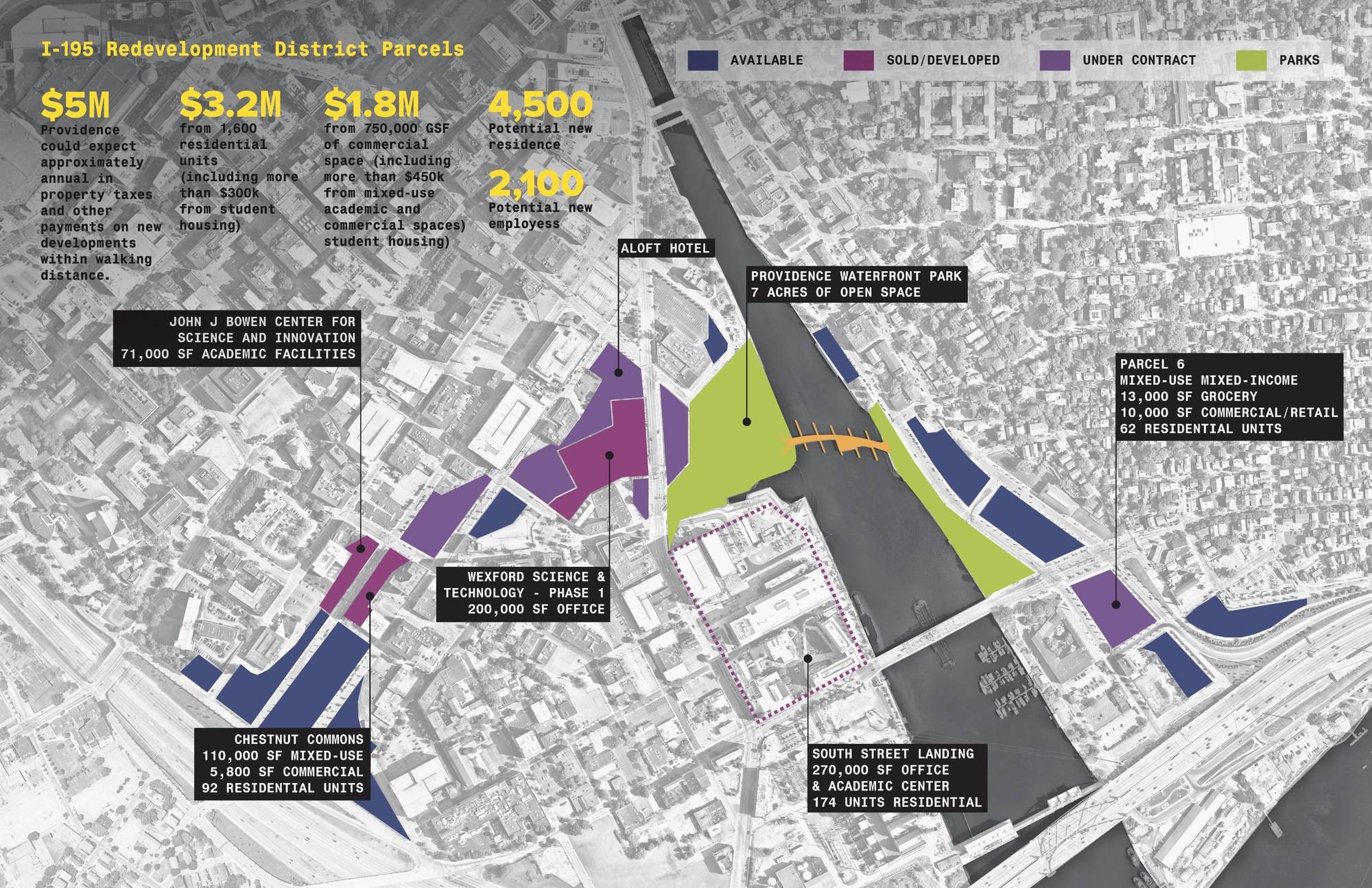 1995年,普羅維登斯基金會和普羅維登斯市請求重新安置I-195號州際公路,以重新連接并激活該城市的邊緣化部分。經(jīng)過若干家公共機構(gòu)、基金會、業(yè)主、居民和非營利機構(gòu)的廣泛規(guī)劃努力,該地區(qū)已重新建立起聯(lián)系,一座十年前不存在的新興城市正在崛起。