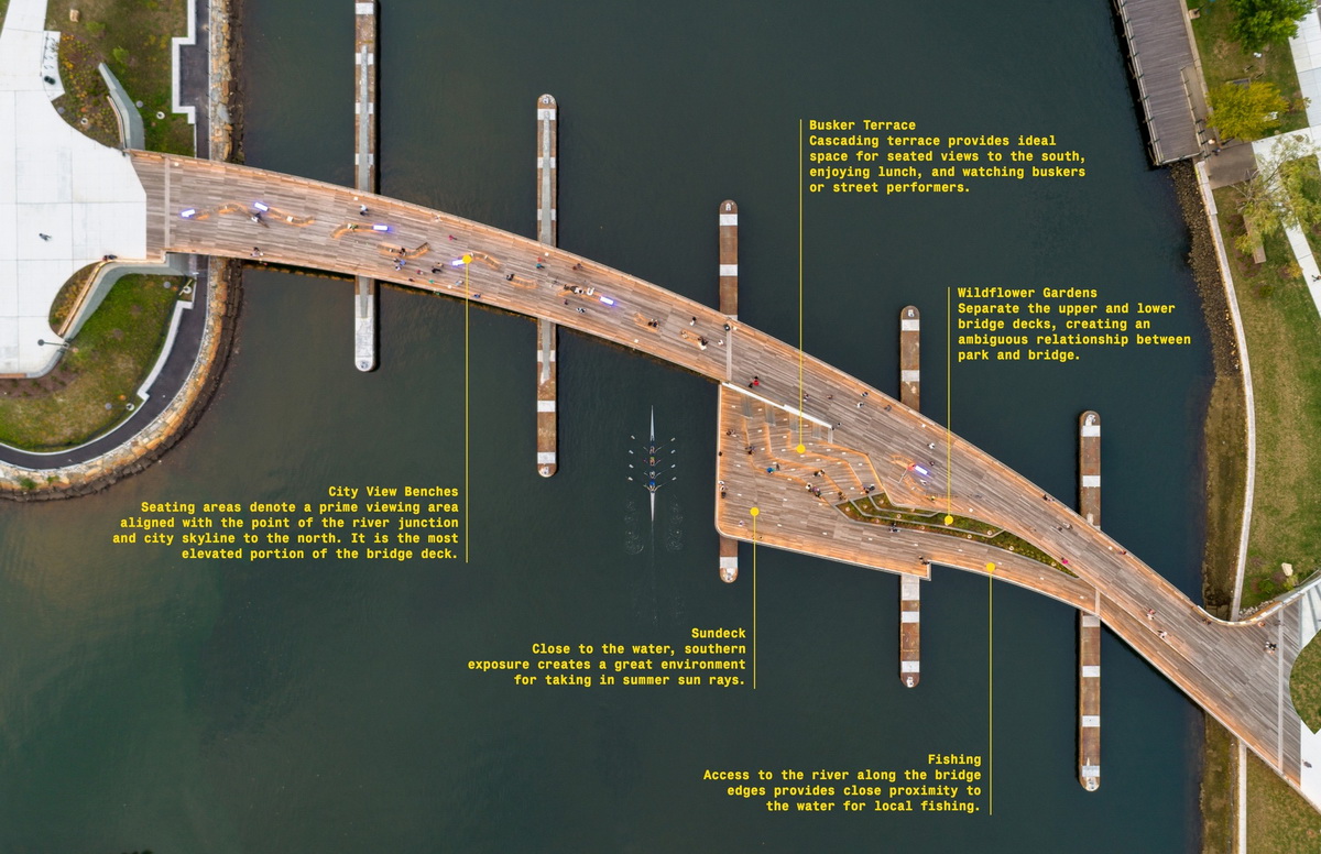 人行天橋的規(guī)劃加強了居住區(qū)、商業(yè)、旅游、文化之間的連通性。同時,該橋梁還激發(fā)了環(huán)境節(jié)點的潛力,向居民和游客展現(xiàn)普羅維登斯、Seekonk、Taunton河以及Narragansett灣的歷史底蘊。