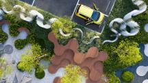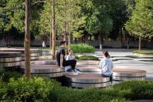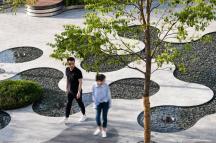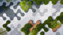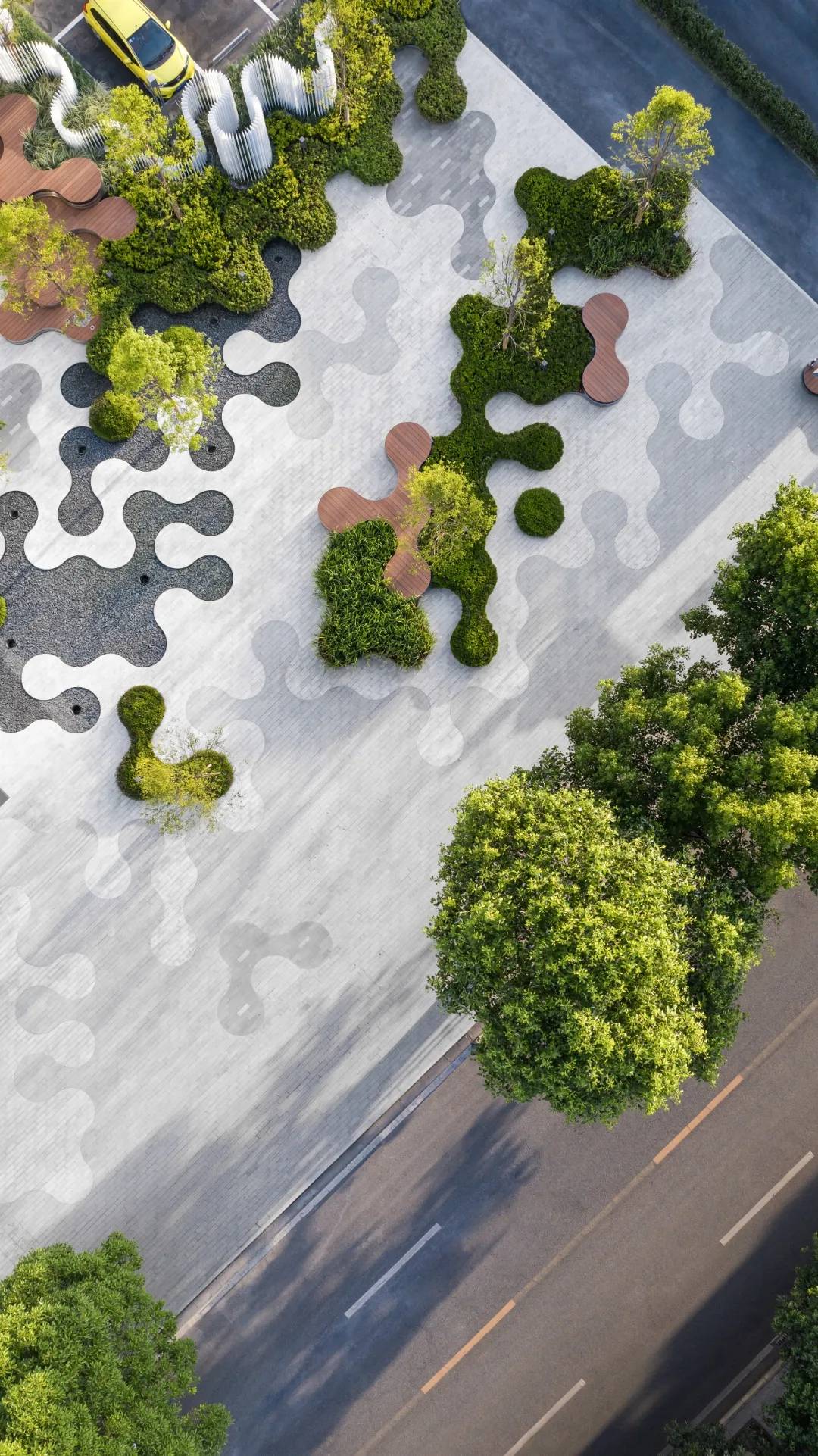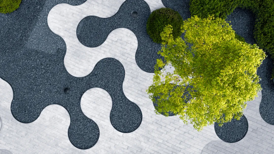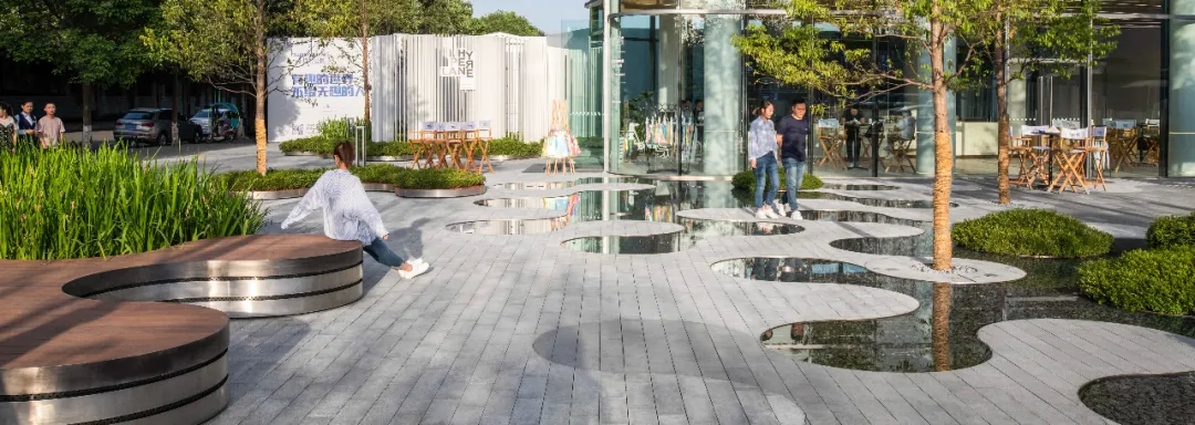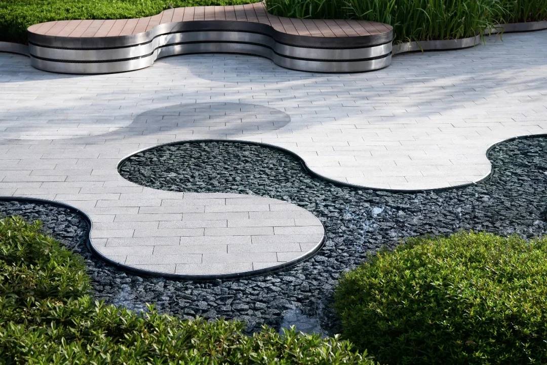 為了充分體現(xiàn)“社區(qū)”的理念,我們以充滿趣味變化豐富的圓形作為點(diǎn)陣衍生出各種多功能空間以及種植與水景等特色景觀元素。圓形要素的設(shè)計(jì)系統(tǒng)地實(shí)現(xiàn)了景觀的靈活性以及各元素統(tǒng)一性之間的平衡,同時(shí)在空間有限的場(chǎng)地種打造出開合有致、空間多樣的體驗(yàn)性場(chǎng)所:地面的靜態(tài)鏡面水景如同迎賓地毯一般,營(yíng)造到達(dá)廣場(chǎng)的儀式感,掩映在植物中間的社交口袋為展示區(qū)的洽談提供半私密空間,也為活動(dòng)策劃提供了基本的功能空間。