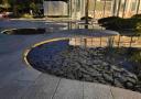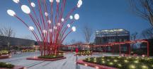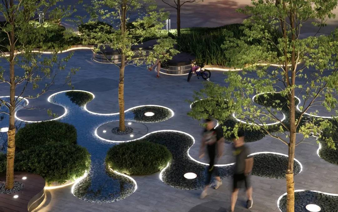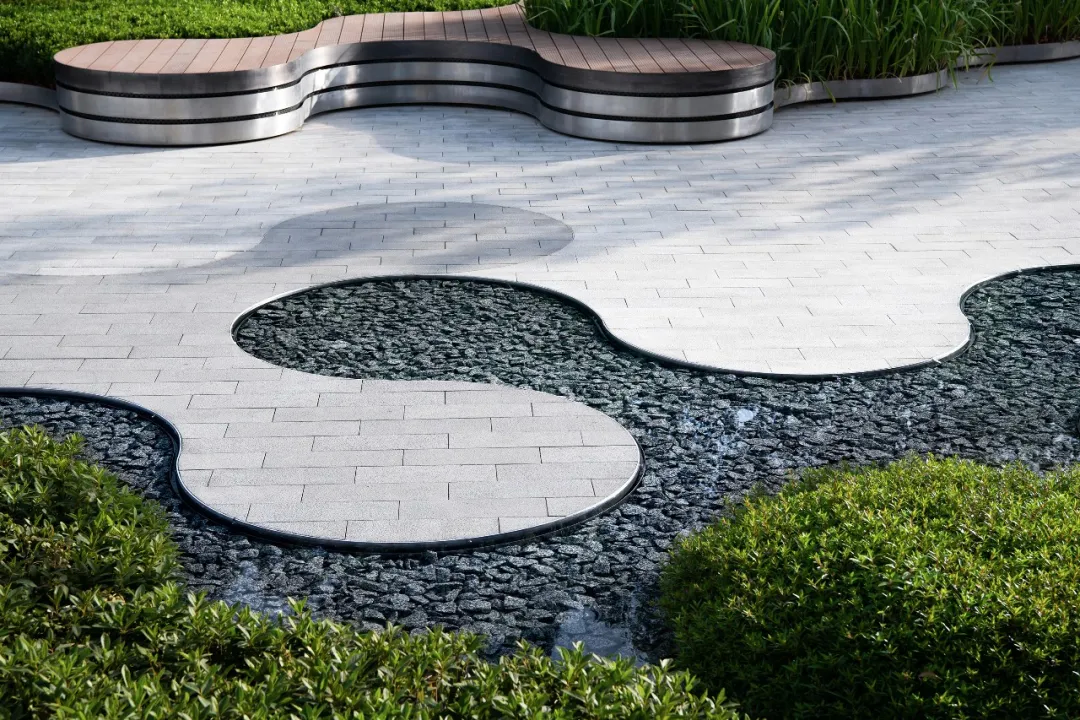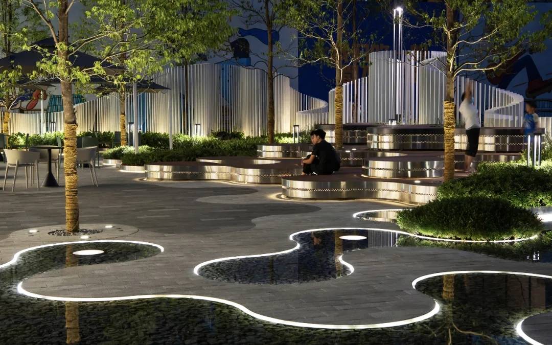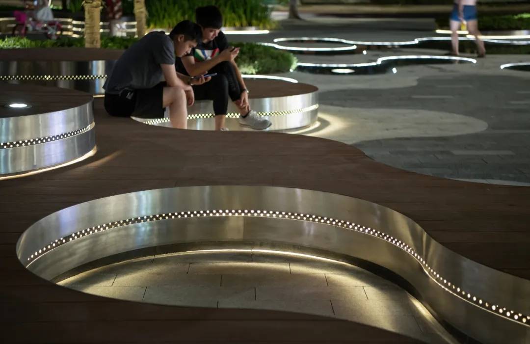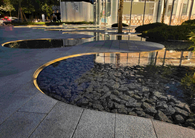 燈光與平坦淺淺的鏡面水景形成對(duì)比,更有趣的是,在圓環(huán)形水景中心出現(xiàn)的循環(huán)回水口如同一個(gè)突現(xiàn)的驚喜,不時(shí)為日景和夜景增加更深遠(yuǎn)的藝境。