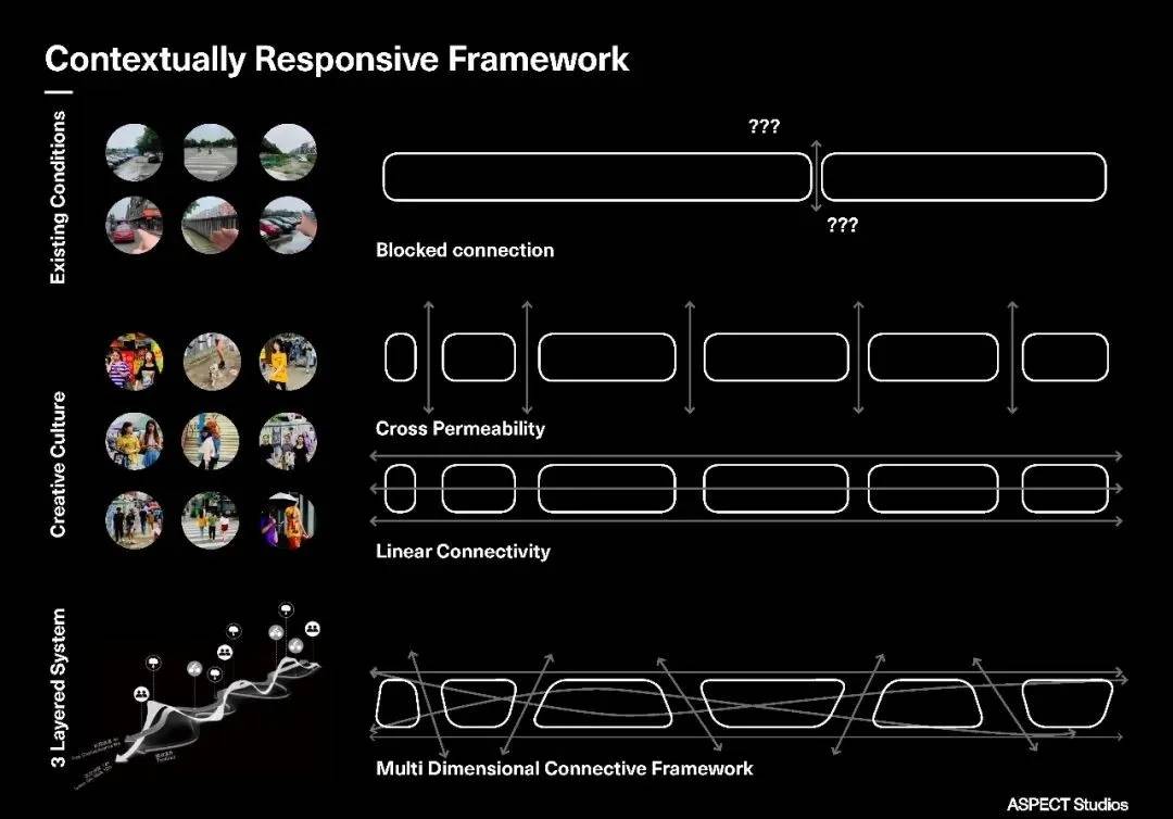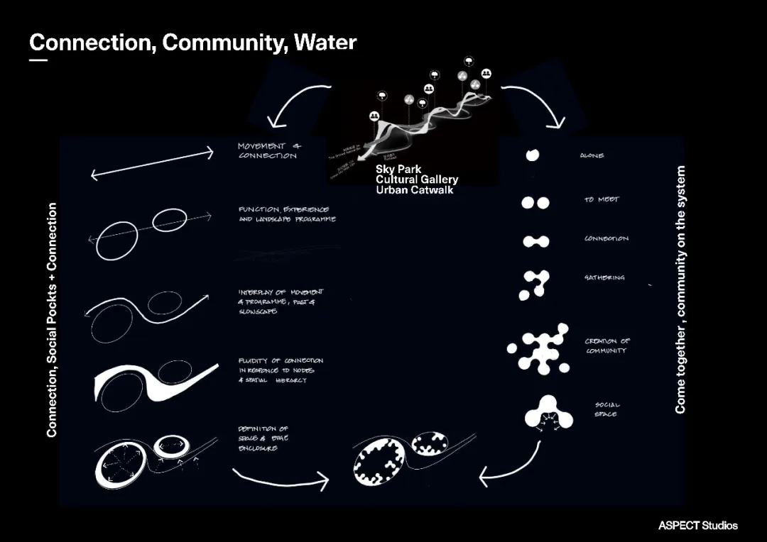 我們景觀設(shè)計(jì)以創(chuàng)造一個(gè)同時(shí)回應(yīng)項(xiàng)目人文與環(huán)境需求的平衡系統(tǒng)為出發(fā)點(diǎn)。面向潮流青年社區(qū)群體的項(xiàng)目長(zhǎng)達(dá)2.4公里連續(xù)景觀長(zhǎng)廊提供了一系列社交、演藝活動(dòng)、創(chuàng)意文化、互動(dòng)藝術(shù)裝置。