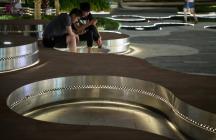 位于場(chǎng)地東側(cè)的雕塑感露臺(tái),為觀眾提供了樹蔭下聚會(huì)交談和觀看演出的機(jī)會(huì)。露臺(tái)邊緣的燈光透過穿孔鋼板映射在地面,營(yíng)造了獨(dú)特充滿活力的夜晚氛圍,為人群提供24小時(shí)全時(shí)段、安全的多維度聚集空間。