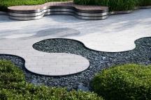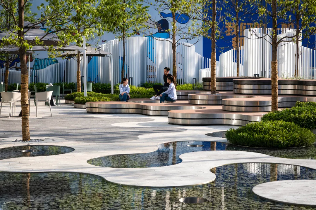 作為展示區(qū)整個(gè)前場(chǎng)空間,都市廣場(chǎng)由包含花卉植物和多方位靈動(dòng)的休閑坐階組成,水景與樹陣一起,構(gòu)成了城市主干道與場(chǎng)地的過渡,同時(shí)為到達(dá)空間提供了視覺連接。