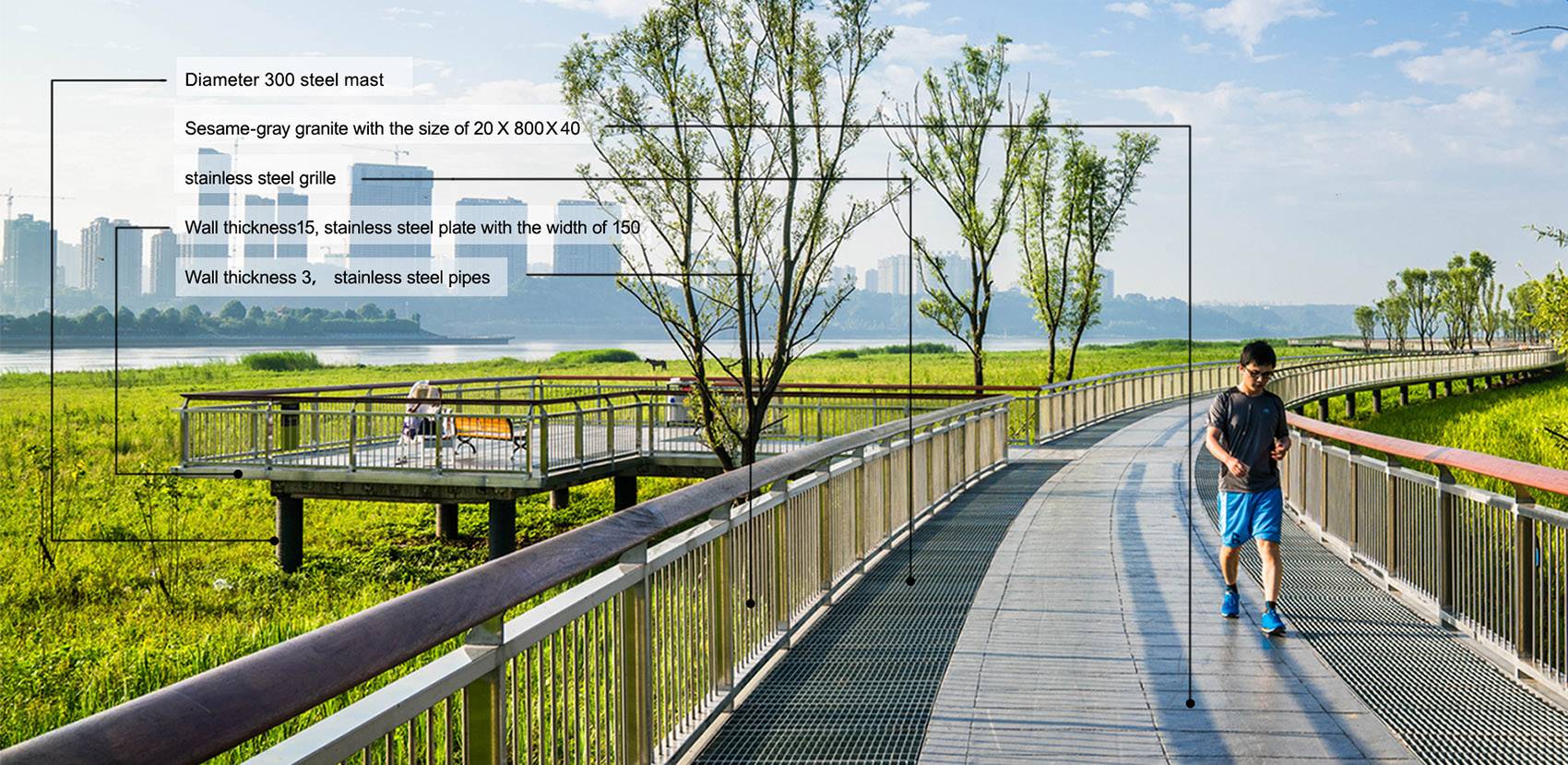 人工裝置的合理選擇:人工裝置主要從自身加固和減少干擾兩方面進行設計。在豐水期水位線以下,灘地步道采用了混凝土、鋼網(wǎng)等耐水材料以對抗河水沖擊;深入水中的柵格棧道和觀景平臺則選擇挑高架設,為植物生長留出足夠的空間,同時可保障行洪的順利進行,從而縮短場地被浸泡的時間。