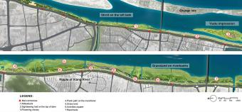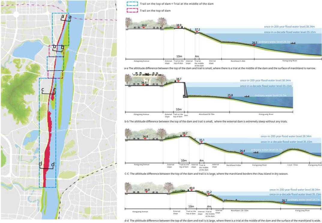 面對多變的生態(tài)基底,設計團隊決定尊重江灘的自然屬性和因季節(jié)而變化的水文特征,以常水位線、豐水期水位線、行洪期水位線為界限,分層次選擇不同的植物策略和場地設計策略。