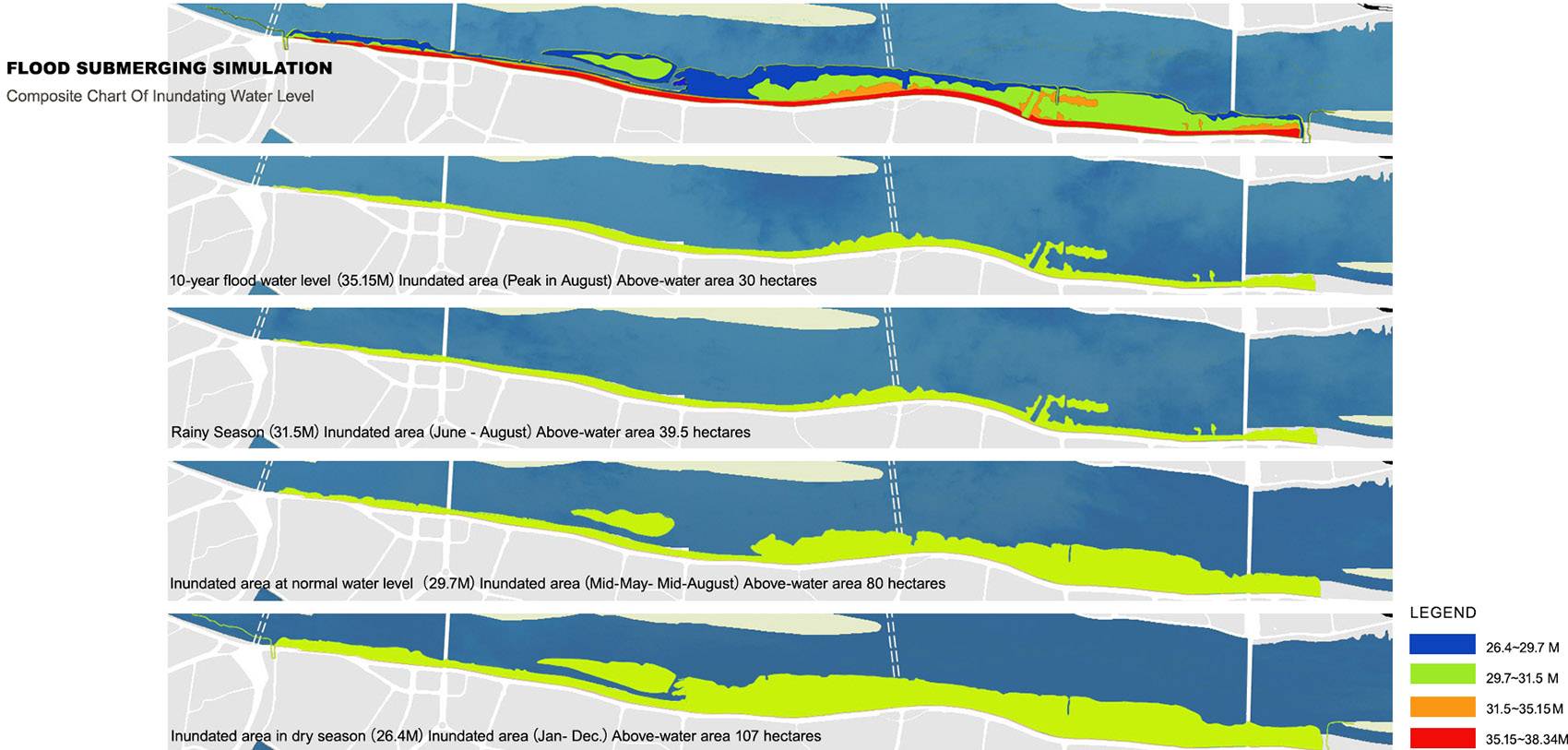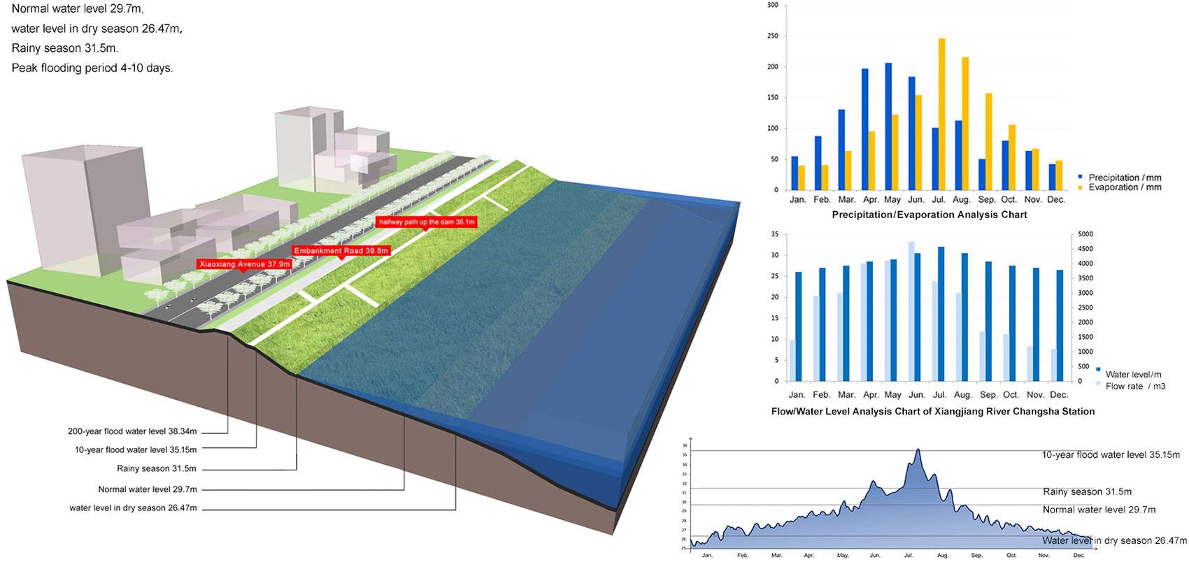 項目場地的水位變化極大,呈現(xiàn)年度循環(huán)的特征:每年九月至次年五月為湘江的低水位時期,這段時間江灘幾乎全部露出水面,甚至有的年份場地還會出現(xiàn)干旱的跡象;而六、七、八三個月是湘江的豐水期,江灘則會遭受不同程度的河水侵蝕。如何在如此不穩(wěn)定的現(xiàn)狀條件下達成設計目標,是此設計的最大挑戰(zhàn)。
