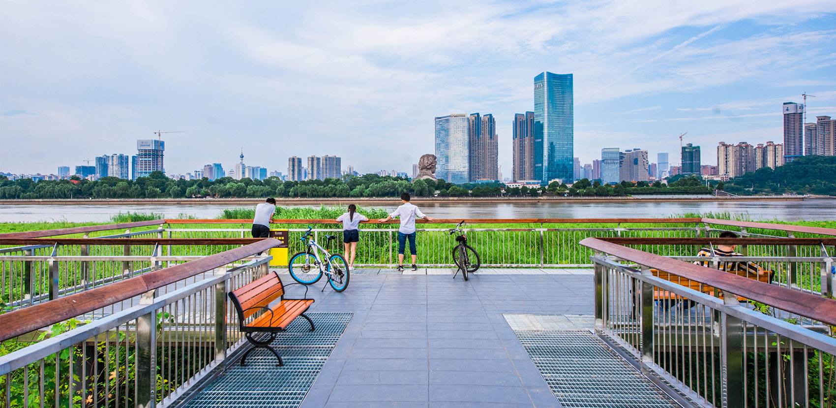 再往下走幾步臺階,江面便鋪在眼前,灘地棧道更是拉近了人與自然的距離,行走在江面、漫步在綠叢,人們紛紛在觀景平臺駐足,西望岳麓山,東觀橘子洲頭,在景區(qū)的拼圖里,聆聽百鳥爭鳴,欣賞隔岸風景。