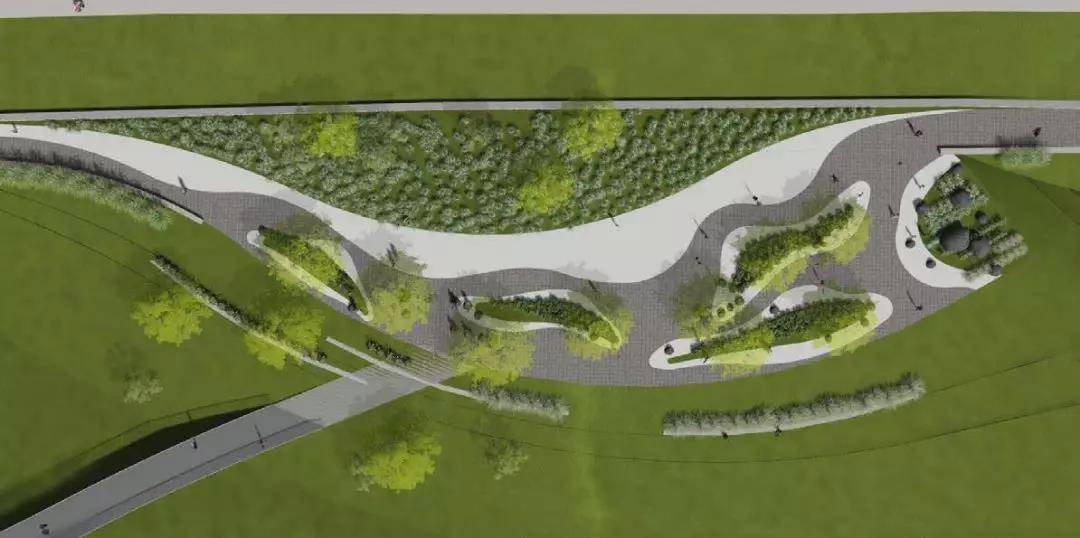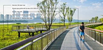 在地勢較平坦的場地設計了五個活動空間,保證豐水期大面積被淹沒的情況下仍舊可以保證市民活動需求,實現(xiàn)城市開放空間的價值。灘地棧道位于常水位線以上,途中延伸出少量觀景平臺,引導人們以最近的距離感受自然的魅力,“無座位”設計可以縮短人的停留時間,以減小其行為對生態(tài)的干擾。