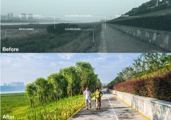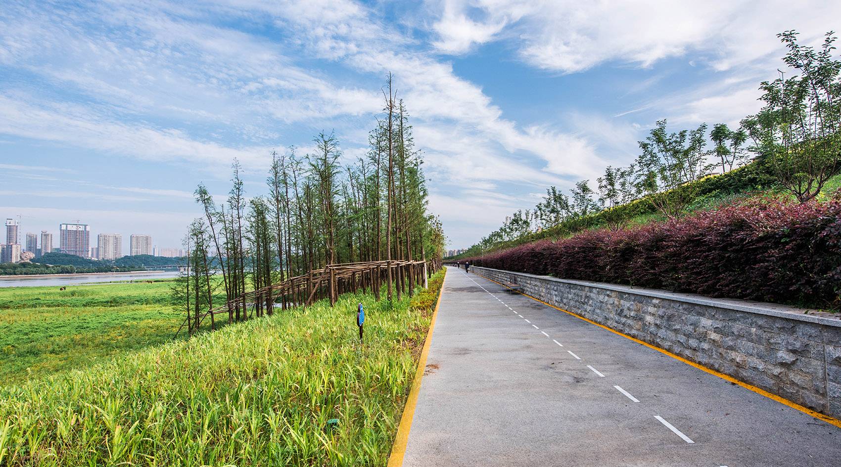 公園的出入口位于堤頂,間距700-1000米布置,主入口的布置與瀟湘大道人行過街設施位置相結合,保證可達性,增加城市與自然的鏈接度。堤腰路位于豐水期水位線以上,設計團隊將現(xiàn)狀道路改造為自行車和步行混行通道,增設座椅、廊架等休憩設施。